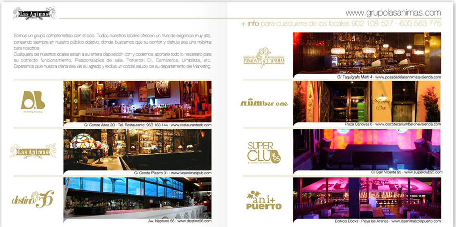 Grupo Las Ánimas se encarga de varios locales de ocio de Valencia: Number One, Don Bernardo, Las Ánimas Puerto, La Posada de las Ánimas, Las Animas, Destino 54 y Súper Club 95. Un conjunto de espacios donde disfrutar de la noche valenciana.
