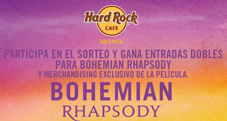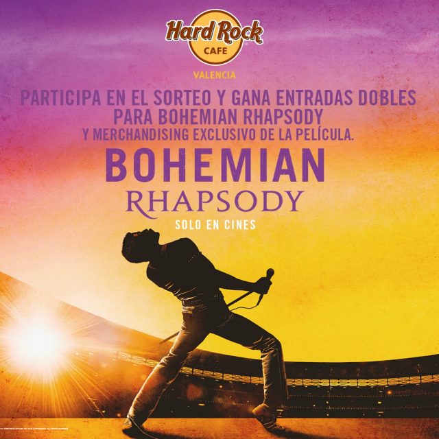 Hard Rock Cafe Valencia tiene algo para ti Entra en un sorteo de merchandising y entradas dobles para ver Bohemian Rhapsody con Hard Rock Cafe Valencia Si eres un amante de Freddy Mercury, tenemos una gran noticia para ti: En Hard Rock Cafe Valencia sortean entradas dobles y merchandising de la película Bohemian Rhapsody (solo en cines). Para ganar, solo tienes que acercarte al local de Hard Rock Cafe Valencia y pedir en recepción tu formulario para inscribirte. Solo con esto entrarás en un sorteo de entradas dobles gracias al 20th Century Fox. La fecha del sorteo será el próximo jueves 8 de noviembre. Así que no lo pienses, y aprovecha esta fantástica oportunidad de ver la gran película de Queen en los grandes cines. Tienes una semana para participar, ¡no lo dudes! Si quieres más información, reservar para comer o cenar puedes enviar un correo a [email protected] o llamar al 962 56 56 53. Cartel: