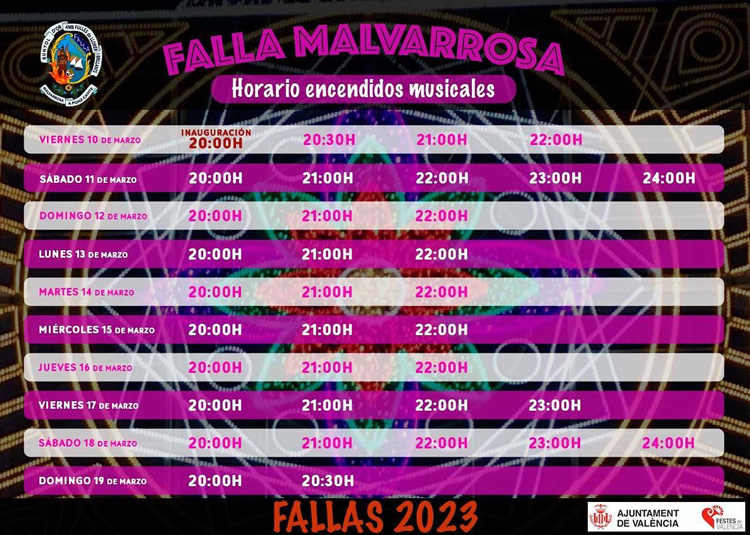 Horario encendido de luces Fallas ¡Disfruta del espectáculo lumínico más sorprendente de las Fallas! AVISO: Pendiente de actualización con la información de 2025. Un año más las luces iluminan el barrio de Ruzafa y la Malvarrosa. Miles de bombillas de diferentes colores y tamaños hacen brillar estas calles al caer la noche. Para no perderte ningún evento estas Fallas consulta el programa de Fallas 2025. El encendido de la iluminación de las calles es uno de los eventos más esperados y llamativos de las fallas. Prueba de ello son las miles de personas que acuden cada día a disfrutar de los espectáculos de luces de las calles iluminadas en Fallas, en los que las bombillas bailan al son de la música. Como en los últimos años, las Fallas de Ruzafa y Convento Jerusalén no tendrán espectáculo de luces, la Falla de Avda. Malvarrosa – A. Ponz – Cavite será la única que tendrá espectáculo piromusical. Todos los días se realiza el encendido de luces*, algunas veces con espectáculo pmusical y otras no. Consulta los horarios para las principales calles: Falla Avda. Malvarrosa – A. Ponz – Cavite Aunque las calles de Ruzafa alberguen hasta 4 fallas que compiten en primera categoría, no cabe olvidar esta falla de la Malvarrosa que todos los años también presenta grandes apuestas. Encienden las luces todos los días del 10 al 19 de marzo a las 20:00h y en cada pase se se escuchará una canción. Inauguración de las luces de la Falla Malvarrosa: Viernes 10 de marzo a las 20:00h Lunes 13 de marzo => 20:00h, 21:00h y 22:00h. Martes 14 de marzo => 20:00h, 21:00h y 22:00h. Miércoles 15 de marzo => 20:00h, 21:00h y 22:00h. Jueves 16 de marzo => 20:00h, 21:00h y 22:00h. Viernes 17 de marzo => 20:00h, 21:00h, 22:00h y 23:00h. Sábado 18 de marzo => 20:00h, 21:00h, 22:00h y 23:00h y 24:00h. Domingo 19 de marzo => 20:00h y 20,30h. Falla Cuba – Puerto Rico La Falla Cuba – Puerto Rico, ganadora de premios mejor calle iluminada 2023, realiza su encendido de luces a las 20:30h. Falla Sueca-Literato Azorín La Falla Sueca-Literato Azorín, enciende sus luces todos los días del 10 al 19 de marzo a las 20:00h. Falla Cuba-Literato Azorín La Falla Cuba – Literato Azorín, ganadora del primer premio del años pasado, inaugura el encendido de luces el vienes 10 de marzo a las 21:00h, siendo la última calle iluminada de Ruzafa. Falla Convent Jerusalem-Matemàtic Marzal La Falla Convent Jerusalem-Matemàtic Marzal participa en la Categoría A de las calles iluminadas. Al igual que el resto de fallas del barrio de Ruzafa no contará con espectáculo musical e inaugurará las luces el viernes 10 de marzo a las 20:45h. El resto de días el encendido se realiza a las 20:00h hasta el domingo 19 de marzo. *Los horarios pueden variar según los cambios que realicen las propias comisiones falleras. Horarios calles iluminadas La única de las Fallas que mantiene su encendido de luces con música es la Falla Malvarrosa. A continuación está el cartel con todos los horarios de la calle iluminada de las Fallas 2023.