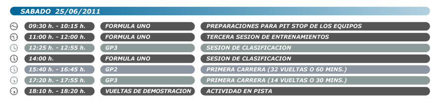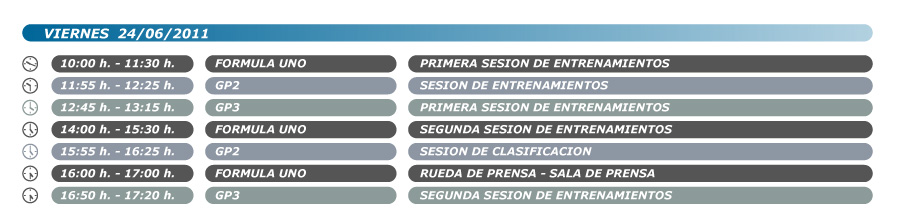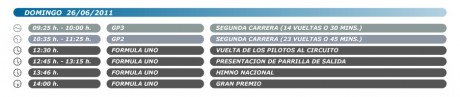 Horarios Fórmula 1 Valencia 2011 La Fórmula 1 de Valencia se celebra del 24 al 26 de junio de 2011 Consulta los horarios de la Fórmula 1 en el circuito de urbano de Valencia. Haz click en las imágenes para desplegar el horario. Viernes, 24 de junio Sábado, 25 de junio Domingo, 26 de junio