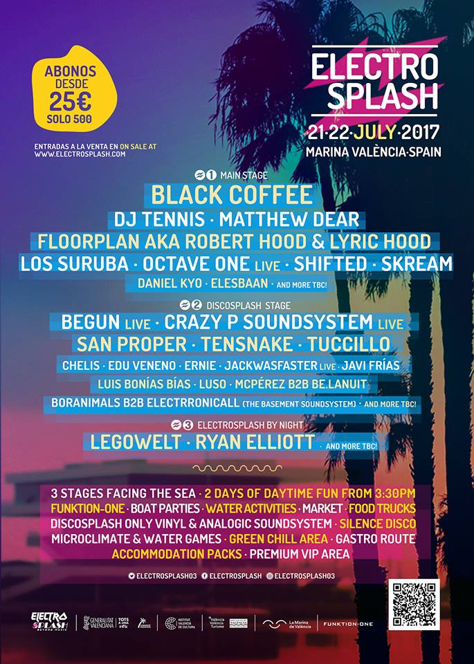 Due giorni di musica elettronica, sole e spiaggia in questo festival che celebra la cultura contemporanea. ElectoSplash 2017 prevede la presenza di artisti internazionali ed emergenti, tra cui Black Coffee, Legowelt, Ryan Elliot, gli artisti di TheBasement Soundsystem. Il festival, che si celebrerà il 21 e 22 luglio, si espande con 3 palchi dove si potrà godere della miglior musica Valencia.