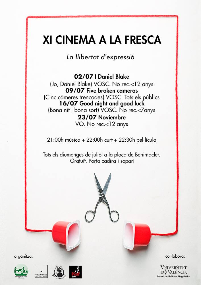 Il quartiere Benimaclet accoglie la XI Edizione del Cinema a la fresca en Benimaclet le domeniche di tutto il mese di luglio. Consulta tutte le info sui cinema estivi a Valencia. Quest’anno il cinema all’aperto a Valencia di Benimaclet porta un cineforum di libertà ed espressione con una selezione di opere di fiction e documentari. La XI edizione del cinema estivo di Benimaclet è gratuita e devi portarti la sedia e la cena da casa per poter godere di questo evento a Valencia. Gli orari sono i seguenti: ore 21 ci sarà un concerto, alle ore 22 la proiezione di un cortometraggio e alle 22.30h si proietterà la pellicola in questione, in versione originale sottotitolata in valenciano o castigliano. Consulta la programmazione e non perdertene neanche uno!