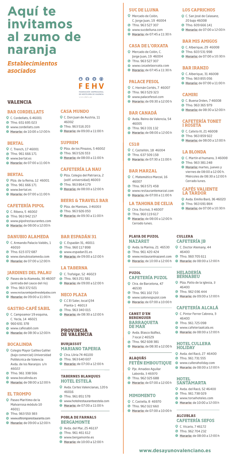 Saranno un totale di 44 locali di Valencia quelli che parteciperanno alla Settimana della Colazione Valenciana, offrendo, insieme alla colazione, un succo d’arancia valenciana certificata completamente gratis.
