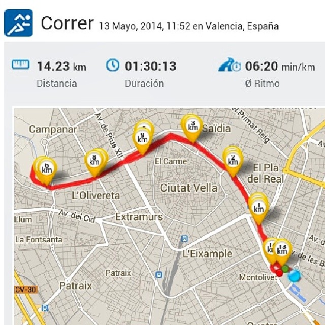 En menos de un mes tengo la 15k nocturna de… (eduiam) En menos de un mes tengo la 15k nocturna de Valencia, mi intención es hacerla en menos de 1’30”, así que comienza el juego de la hora y media, correr todo lo que pueda en ese tiempo. Vamoooos!!!
