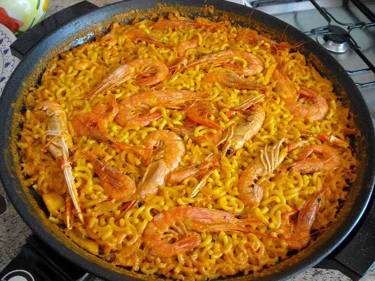 Alla base di questo piatto di mare ci sono i fideos, pasta forma è allungata e di sezione tonda, simile agli spaghetti o alle linguine, ma con una lunghezza che varia tra uno e due centimetri, che qui vanno a sostituire il riso tipico della paella spagnola.