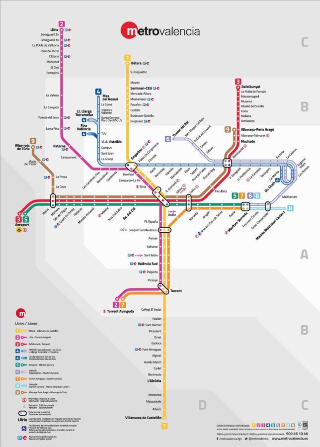 - Linea 1: (Bétera – Villanueva Castellón) copre quasi 100 km ed è la più lunga.