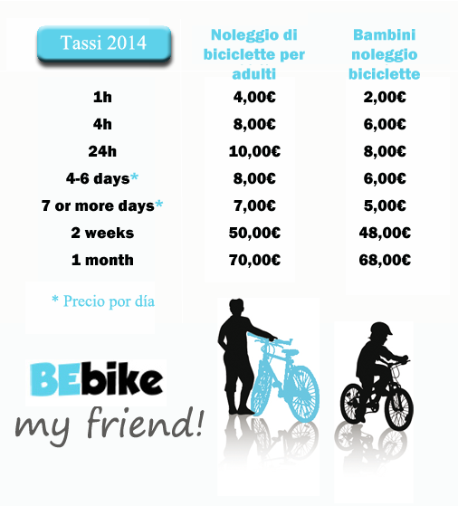 Inoltre si suddividono i prezzi in base ai giorni (giorni infrasettimanali, festivi e weekend). Per l’affitto è necessario un documento (carta d’identità, passaporto, patente) e una cauzione di 50 euro per ogni bici (la cauzione può essere pagata con contanti o con carta di credito).