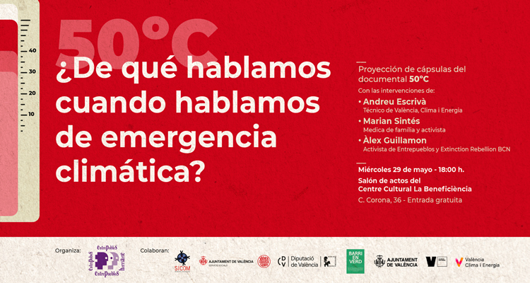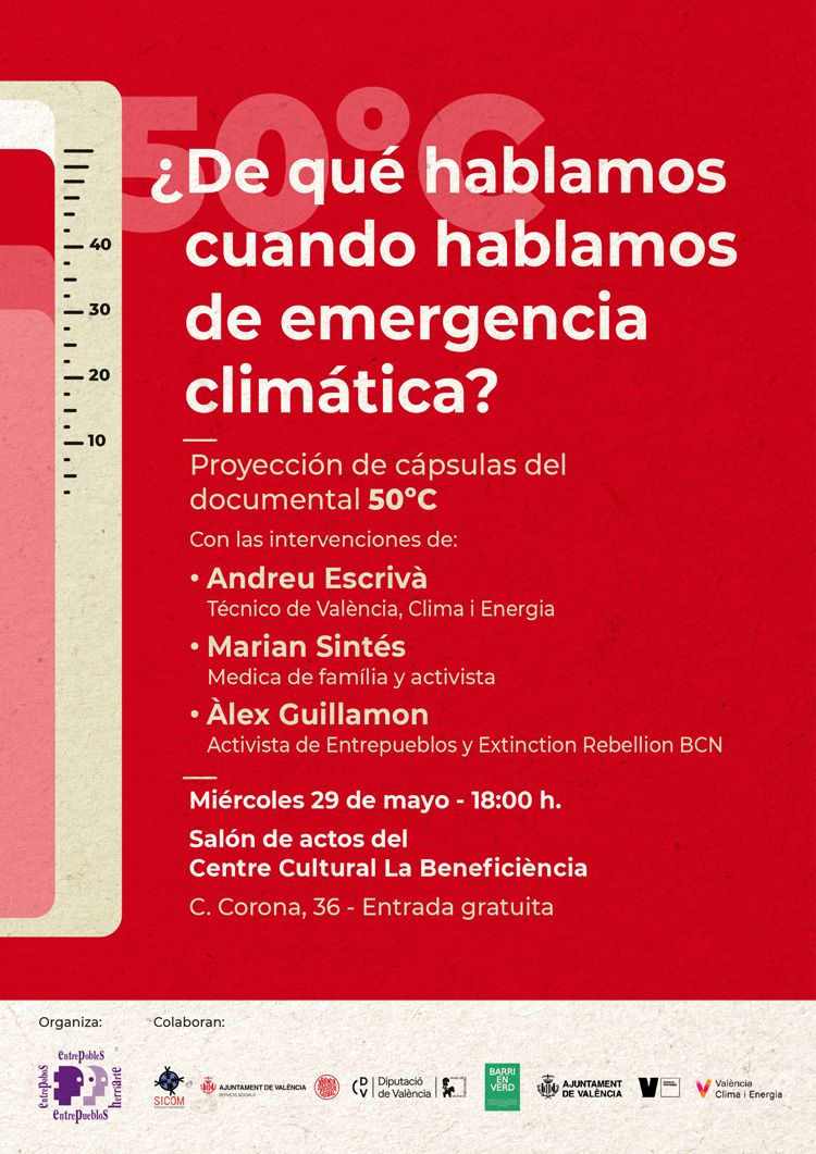 Jornada gratuita en Valencia sobre la emergencia climática Entrepueblos organiza ¿De qué hablamos cuando hablamos de emergencia climática?. Una jornada gratuita y participativa en Valencia para generar conciencia y acción sobre la emergencia climática Valencia ha sido elegida como Capital Verde Europea en 2024 y se une así a la lista de ciudades europeas comprometidas con la protección del medio ambiente. Sin embargo, durante los últimos años, en la ciudad se han intensificado los fenómenos climáticos, el aumento de las temperaturas y el incremento del nivel del mar, entre otros. Valencia, y todo el planeta, se enfrenta por tanto a un desafío global urgente: hacer frente a la emergencia climática. Para generar conciencia y acción acerca de este problema, el próximo miércoles 29 de mayo, a las 18:00h, el salón de actos del Museo de Prehistòria de València (MUPREVA), en la Beneficència de València, acoge la jornada “¿De qué hablamos cuando hablamos de emergencia climática?”, organizada por Asociación Entrepobles. El acceso es libre y el acto forma parte de la iniciativa ‘Museu en verd’ del “Proyecto Barrio”, impulsado por MUPREVA, en colaboración con el Ajuntament de València. En la jornada participarán Andreu Escrivà, ambientólogo divulgador y técnico de proyectos ambientales de la Fundación València Clima y Energía; Marian Sintes, médica de atención primaria, activista de AE-Agró y de la Comissió Ciutat-Port; y Àlex Guillamón, activista de Entrepobles y Extinction Rebellion Barcelona. Proyección del documental ‘50°C’ y exposición sobre Migraciones Climáticas Durante el evento se proyectarán fragmentos de “50°C”, un documental de SICOM y Entrepueblos que explica los impactos del cambio climático, los límites de las energías renovables, la salud y los desplazamientos y migraciones climáticas. Además, se instalará una exposición sobre una exposición sobre migración y desplazamiento de las personas por causas ambientales. La muestra reflexiona sobre los problemas que sufren las personas y comunidades que tienen que abandonar sus casas y lugares de origen debido a la emergencia climática, y la necesidad de cambiar la normativa actual para garantizar el derecho de asilo por causas ambientales, las causas de la degradación ambiental y el peligro, aún mayor, para las personas defensoras del medio ambiente. Entrepueblos es una asociación que promueve la educación transformadora, la incidencia política y la cooperación solidaria con Latinoamérica. Más información en https://www.entrepueblos.org/