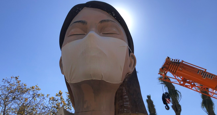 La Falla Municipal con mascarilla por el coronavirus Los artistas falleros le colocan una mascarilla gigante a la Falla Municipal que se encuentra a medio montar tras la suspensión de las Fallas 2020 en marzo Ayer, el Presidente de la Generalitat, Ximo Puig, comunicó la decisión de aplazar la celebración de las fiestas de las Fallas y la Magdalena en toda la Comunidad Valenciana, siguiendo los consejos del Ministerio de Sanidad y de los expertos de salud pública. La suspensión de todos los actos de Fallas 2020 viene dada por la crisis del coronavirus que está afectando a varios países y que se toma para evitar más contagios. Según palabras del Presidente esta medida se realiza “por responsabilidad, por indicación de los expertos y pensando en el bien general de la población“. Los artistas falleros Manolo Martín y José Ramón Espuig, que junto con el artista urbano Escif son los encargados de la Falla Municipal 2020, le han colocado esta mañana una mascarilla gigante a la pieza principal de la Falla que este año tiene por lema: ‘Açó també passarà‘. Hasta que se decida si se retiran los monumentos o se queman, en la Plaza del Ayuntamiento se podrá visitar la Falla Municipal 2020 a medio montar.