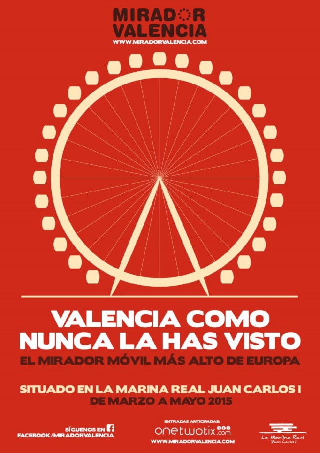 La Noria móvil más grande de Europa en La Marina Real La Noria de 70 metros de alto permite una visión panorámica de 360º y hasta 30 kilómetros a la redonda La Marina Real cuenta hasta el 25 de julio, (actualizado el 15 de julio) con la gran noria móvil Mirador Valencia para el disfrute de todos los visitantes del recinto, situada en la explanada junto al canal, donde se encuentra la pérgola. La Noria Mirador Valencia cuenta con 42 cabinas climatizadas y adaptadas, con capacidad para 8 usuarios, por lo que permite acoger simultáneamente hasta 336 personas. Mirador Valencia alcanza una altura de 70 metros permitiendo disfrutar de unas espectaculares vistas de 360 grados de la ciudad y el frente litoral, hasta 30 kilómetros a la redonda Mirador Valencia ocupa un espacio de unos 1.500 metros cuadrados, entre los pilares principales y la plataforma de acceso. Está iluminada por 20.000 bombillas LED de bajo consumo, que permiten diferentes combinaciones de luces. Entradas Hay dos tipos de entradas para disfrutar de Mirador Valencia: • Entrada General a 7€ • Entrada Infantil a 5€ (únicamente serán válidas para menores con una altura máxima de 1,20 m) Las entradas pueden adquirirse en la taquilla de Mirador Valencia o por Internet desde su página web. Las entradas adquiridas por Internet tendrán acceso directo a la atracción sin necesidad de pasar por taquilla. Se accederá por unas escaleras centrales donde se validará la entrada, que deberá llevarse impresa. Horarios: Domingo a jueves (ambos incluidos): de 10:00 a 0:00 horas. Viernes, sábados y previos a festivos: de 10:00 a 3:00 horas. Ubicación *Ampliado hasta el 1 de noviembre