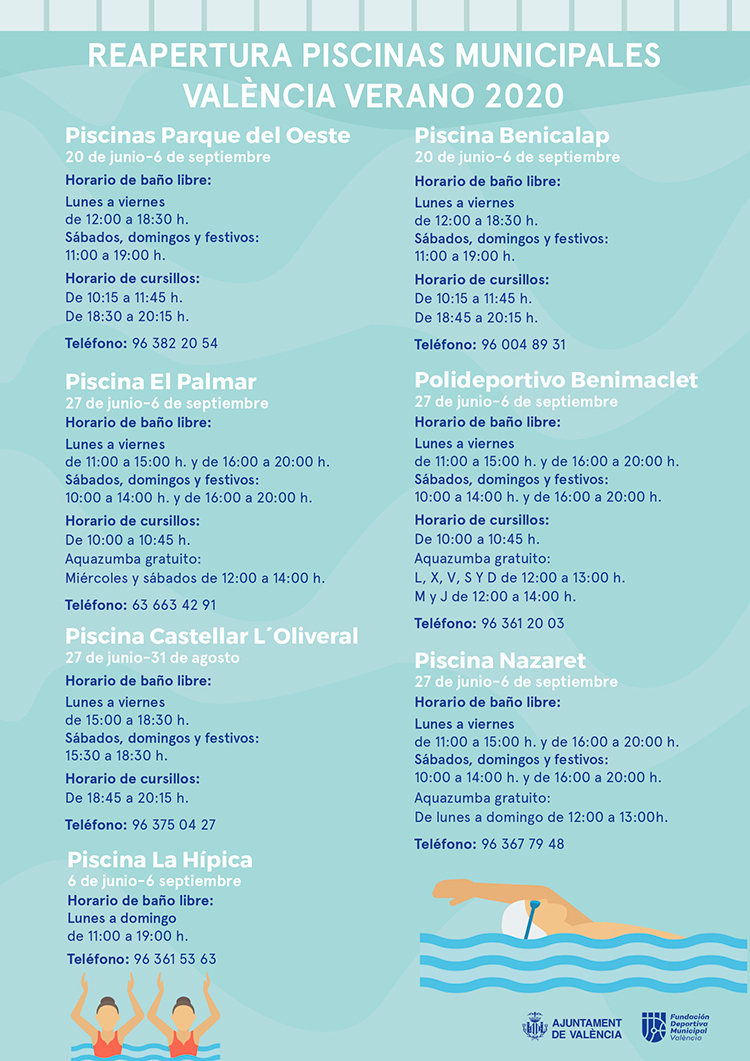 Las piscinas municipales de València abren con medidas sanitarias Las piscinas municipales de València abren este verano 2020 con todas las medidas de sanitarias. Consulta las normas del Covid-19 en las piscinas descubiertas Ya estamos en verano y aunque este año sean unas vacaciones atípicas, desde el Ayuntamiento de València y la Fundación Deportiva Municipal abren las piscinas municipales de verano siguiendo todas las medidas sanitarias necesarias para poder disfrutar en pareja, con amigos o en familia de las piscinas al aire libre de València. Desde el 20 de junio y hasta el 6 de septiembre puedes disfrutar de un día refrescante al aire libre en las siete piscinas descubiertas de València siempre cumpliendo con las medidas contra el coronavirus. ¡Sumérgete en las piscinas! Precio y entrada para las piscinas Debido a la restricción de aforos y a la aplicación de los nuevos protocolos como consecuencia de la pandemia Covid-19, solo se ofertarán los siguientes tipos de entrada y bonos en las piscinas de Benimaclet, Nazaret y El Palmar. Entrada diurna (utilización libre): 3,35 € Entrada diurna (utilización libre) tarifa reducida: 1,70 € La tarifa reducida se aplica en personas menores de 16 años, excepto en aquellas actividades cuya normativa específica establezca la obligación de pago o la aplicación de precios públicos especiales. Personas que tengan la condición de jubilado, pensionista o mayor de 65 años y aquellas personas con discapacidad en grado igual o superior al 33%. Las piscinas también disponen de un bono de 10 o 20 usos, así como de un abono individual de temporada. Puedes consultar toda la información sobre las piscinas abiertas en el siguiente enlace: piscinas descubiertas de verano. Para la piscinas Parque del Oeste y Benicalap, los bonos tendrán un precio diferente (consultar en la web de Aquaval), aunque los precios de la entrada diurna serán los mismos: Entrada diurna (utilización libre): 3,35 € Entrada diurna (utilización libre) tarifa reducida: 1,70 € En caso de que se acuda a alguna de las piscinas descubiertas de verano que gestiona directamente la Fundación Deportiva Municipal de València, tales como la piscina Benimaclet, Nazaret y El Palmar, se deberá entregar firmada alguna de las siguientes declaraciones de responsabilidad para poder acceder y hacer uso de dichas instalaciones: Declaración Responsable Individual Piscinas Valencia 2020 ANEXO I Declaración Responsable de Grupo Piscinas Valencia Verano 2020 ANEXO II Compra de entradas y reservas de plazas para el verano 2020 Para acceder a la piscina es obligatorio realizar la reserva de la plaza a través del número de teléfono de la instalación, mientras la aplicación de gestión de entrada no esté operativa. La reserva de plaza para el baño sólo se podrá realizar con una antelación de hasta 3 días. Los menores de 14 años deberán acceder bajo la responsabilidad de un adulto, que deberá gestionar la entrada y tramitar la reserva del menor. Un usuario/a solo podrá comprar un máximo de 4 entradas. Con la finalidad de aprovechar al máximo el aforo, el/a usuario/a podrá elegir 1 solo turno (mañana o tarde) o 2 turnos (mañana y tarde) de la misma jornada. La piscina cerrará 1 hora entre los dos turnos (de 15:00 a 16:00 h. de lunes a viernes y de 14:00 a 15:00 h. sábados, domingos y festivos) para limpieza y desinfección. Debido a la reducción de aforo este año, si el/a usuario/a no hiciera uso de la entrada en la fecha y turno elegido, la FDM se reserva el derecho de ofrecerle el acceso en las 72 h. posteriores siempre que no haya aforo completo. El/a usuario/a deberá firmar una declaración de responsabilidad en el acceso a la instalación, que puede encontrarse al inicio de esta página, y deberá entregarla cumplimentada. En el caso de los grupos, será el responsable del grupo quién firme esta declaración de responsabilidad en nombre de todos los integrantes del mismo. Para cualquier otra gestión deberá llamar al teléfono de la instalación. Horario de las piscinas municipales de València Desde que València entró en la Fase 3 de la desescalada y acorde con la normativa, las piscinas descubiertas de la ciudad han abierto sus puertas para que todos puedan disfrutar este verano 2020 de una forma segura y refrescante. Además es un buen plan para hacer en verano con niños. A continuación puedes consultar el horario de baño libre y los cursillos en las siete piscinas municipales de València. Normas de acceso y uso de las piscinas recreativas A la entrada se procederá a la desinfección de manos y calzado, y todo tipo de material o equipo. En la entrada y la salida de la instalación se seguirá el circuito o recorrido preestablecido. Será obligatorio el uso de mascarilla en los desplazamientos dentro de la instalación y en la zona recreativa de playa (en el caso de que no se pueda mantener la distancia de seguridad). Solo se podrá utilizar los vestuarios para cambiarse. No estará permitido el uso de las duchas de los vestuarios, ni de las taquillas. No se podrá hacer uso de las duchas de los vestuarios, ni de las taquillas, por lo que una vez los usuarios/as se haya cambiado han de acceder a la playa de piscina con toda la ropa y objetos personales guardados en una bolsa o mochila, que deberá permanecer dentro del perímetro de seguridad establecido, evitando el contacto con el resto de usuarios/as, a excepción de la toalla. Los vestuarios/as tendrán el aforo restringido y habrán marcadas zonas de seguridad. Por regla general no podrán acceder más de 3-4 personas (en función del aforo que estará indicado en la puerta de acceso), a no ser que sean de la misma unidad familiar. Se habilitarán las duchas de la playa de la piscina para aquellos/as usuarios que quieran ducharse. En las zonas alrededor de la piscina se establecerá una distribución espacial mediante señales en el suelo a efectos de garantizar la distancia de seg