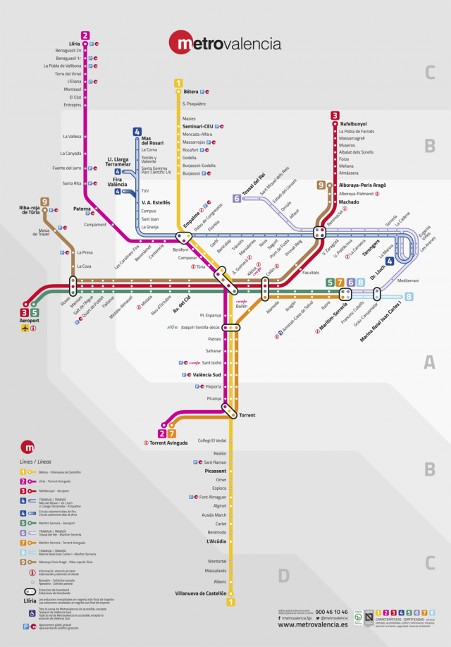 Línea 7 MetroValencia Consulta el recorrido de la línea 7 de Metrovalencia La línea 7 de MetroValencia comunica Marítim- Serrería hasta Torrente. Su color distintivo es el naranja. La línea 7 de Metrovalencia es una escisión de la línea 5, concretamente el ramal que va de Torrent Avinguda a la Estación de Marítim-Serrería, pasando por la estación intermodal de Bailén. Facilitando la comunicación con parada en puntos estratégicos como: Calle Colón de Valencia Estación de AVE Joaquín Sorolla Paiporta Picanya Consulta el Mapa de MetroValencia