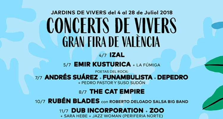 Los Conciertos de Viveros traen a Rozalén, Izal, Los Secretos y muchos más artistas Se ha anunciado un avance del cartel de los Conciertos de la Gran Fira de València y el cartel no puede ser más variado. ¡Consúltalo! 02-05-2018 Els Concerts de Vivers vuelven un año más a València en verano como parte de la programación de la Gran Fira de València. 19 días de conciertos para amenizar las altas temperaturas y disfrutar de una oferta musical variada y de calidad, con artistas locales, nacionales e internacionales. En palabras del Concejal de Fiestas Pere Fuset, que ha presentado hoy el cartel en rueda de prensa, hay un 60% de grupos internacionales combinados con españoles y un 25% de bandas de la escena local valenciana. Además, hay un 30% de presencia femenina sobre los escenarios. El cartel incluye desde grupos y cantantes de actualidad en el panorama español como Rozalén, Andrés Suárez, Izal y Morat hasta veteranos de la industria como Niña Pastori, Caetano Veloso, Rosendo e Iván Ferreiro. El cartel internacional cumple con Bomba Estéreo, Residente (de Calle 13) e Icona Pop, entre muchos otros. Consulta el cartel, elige qué conciertos son tus favoritos y pilla las entradas para los Conciertos de Viveros. ¡El verano está cada vez más cerca! Cartel
