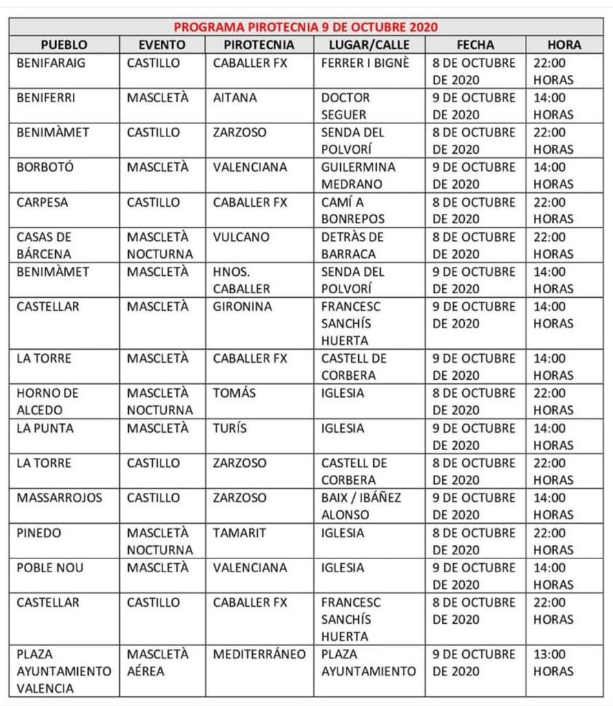 Mascletaes y castillos por el 9 de octubre Espectáculos pirotécnicos los días 8 y 9 de octubre para celebrar el Día de la Comunidad Valenciana 2020 Los espectáculos pirotécnicos que no se pudieron celebrar estas Fallas 2020 por la suspensión a causas de la crisis sanitaria del coronavirus, se dispirarán con motivo del 9 d’octubre. Consulta toda la programación del 9 de octubre 2020. Mascletaes y castillos de fuegos artificiales llenarán de luz y pólvora el cielo los días 8 y 9 de octubre. Para evitar que haya aglomeraciones, el Ayuntamiento de València ha decidido disparar los espectáculos pirotécnicos desde distintos pueblos de València. Además ha señalado que los espectáculos pirotécnicos están pensados como un acompañamiento simbólico a la celebración particular de este Nou d’Octubre, por lo cual se insta a la ciudadanía a disfrutar de los espectáculos desde sus domicilios (balcones, azoteas…) o desde espacios abiertos que permitan mantener la distancia física aconsejable en este momento. Se ruega que no se produzcan desplazamientos entre los cascos urbanos y aglomeraciones para garantizar las medidas de seguridad y evitar cualquier incidencia. A continuación puedes consultar dónde se celebran las mascletaes y castillos del 9 de octubre 2020. Jueves 8 de octubre 22.00 h. Espectáculos pirotécnicos en los pueblos de València. Benifaraig, castillo de la pirotecnia Caballer FX. Benimàmet, mascletà de la pirotecnia Zarzoso. Carpesa, castillo de la pirotecnia Caballer FX. Les Cases de Bàrcena, mascletà nocturna de la pirotecnia Vulcano. Castellar, castillo de la pirotecnia Caballer FX. El Forn d’Alcedo, mascletà nocturna de la pirotecnia Tomás. La Torre, castillo de la pirotecnia Zarzoso. Pinedo, mascletà nocturna de la pirotecnia Tamarit. Viernes 9 de octubre, Día de la Comunidad Valenciana 12.00 h. Acto institucional en el Salón de Cristal. Al acabar el acto, mascletà aérea de la pirotecnia Mediterráneo desde la azotea del Ayuntamiento. 14.00 h. Espectáculos pirotécnicos en los pueblos de València. Beniferri, mascletà de la pirotecnia Aitana. Benimàmet, mascletà de la pirotecnia Hermanos Caballer. Borbotó, mascletà de la pirotecnia Valenciana. Castellar, mascletà de la pirotecnia Gironina. El Poble Nou, mascletà de la pirotecnia Valenciana. La Punta, mascletà de la pirotecnia Turís. La Torre, mascletà de la pirotecnia Caballer FX. Massarrojos, mascletà de la pirotecnia Zarzoso. Programa pirotécnico 9 de octubre 2020 El jueves 8 de octubre tendrán lugar de manera simultánea de mascletà nocturna y castillos para celebrar el Día de la Comunidad Valenciana a las 22:00h en Benifaraig, Benimàmet, Carpesa, Les Cases de Bàrcena, Castellar, El Forn d’Alcedo, La Torre y Pinedo. Al día siguiente, viernes 9 de octubre, y concidiendo con la fiesta de los valencianos a las 14:00h se podrá disfrutar de una mascletà en València, Beniferri, Benimàmet, Borbotó, Castellar, El Poble Nou, La Punta, La Torre y Massarrojos.