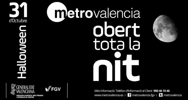 Metrovalencia abierto toda la noche en Halloween Metrovalencia dará servicio durante toda la noche el 31 de octubre Los trenes y tranvías de Metrovalencia circularán en Halloween, sábado 31 de octubre, durante toda la noche. Es la primera vez que Ferrocarrils de la Generalitat Valenciana (FGV) programa circulaciones extraordinarias con motivo de dicha fiesta. Se recomienda mirar los horarios ya que los trenes y tranvías circularán en distintas frecuencias, según las líneas. Metrovalencia ofrece este servicio con el fin de que los usuarios puedan desplazarse hasta los distintos actos y actividades que se organizan en la ciudad para celebrar Halloween. Desde Love Valencia te recomendamos las mejores fiestas de Halloween en Valencia. Este servicio especial recibe el nombre de “Metrovalencia, abierto toda la noche” y permite poner servicio las seis líneas de metro y las tres de tranvía, que dispondrán como mínimo, trenes cada 40 minutos por el área metropolitana de Valencia, delimitada por las estaciones de Aeroport, Empalme, Alboraia Peris Aragó, Marítim Serrería y Torrent Avinguda. Los intervalos de paso a Seminari y Paterna serán de 80 minutos y se habilitarán dos circulaciones durante la noche a Picassent, Riba-roja de Túria y Rafelbunyol. En cuanto al tranvía, la Línea 4, entre Vicente André Estellés y Doctor Lluch, las circulaciones serán cada 40 minutos, además de dos tranvías adicionales hasta Mas del Rosari. La Línea 6, Tossal del Rei-Marítim Serrería, tendrá servicio cada 80 minutos, por lo que el tiempo de espera en el tramo común con la Línea 4, (de Primado Reig a Doctor Lluch) se reducirá. Por último, la Línea 8, Marítim Serrería-Marina Reial Joan Carles I, dispondrá de unidades cada 30 minutos. Metrovalencia facilitará esa noche la conexión entre líneas en las estaciones de transbordo de Empalme, Àngel Guimerà y Marítim Serrería y se reforzarán los servicios de Atención al Cliente, limpieza y seguridad para que el servicio discurra con la mayor normalidad. Todos los Santos Por otro lado, Metrovalencia acercará el próximo domingo 1 de noviembre a sus usuarios a los cementerios cercanos a su red con motivo de la celebración del Día de Todos los Santos. El metro y tranvía en Valencia acercan a los usuarios a los Lugares Santos de la capital del Turia (Cementerio General, del Cabanyal y de Benimaclet) y de Burjassot gracias a sus estaciones y paradas en San Isidre; La Carrasca, Serrería, La Cadena y Tarongers; Benimaclet; y Vicente Zaragozá; y Andrés Estellés y TVV, respectivamente. Todos aquellos usuarios que deseen ampliar la información de horarios y frecuencias de este servicio pueden consultar en la página web www.metrovalencia.es y en el teléfono gratuito de información y Atención al Cliente 900 46 10 46, así como en sus redes sociales: @metrovalencia y en facebook/metrovalencia.fgv.