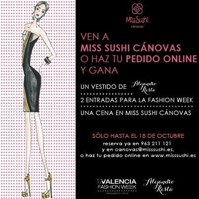 Miss Sushi Cánovas y Valencia Fashion Week Si te encanta la comida japonesa y la moda, ve a comer o a cenar a Miss Sushi Cánovas y gana uno de sus estupendos regalos Con la llegada de la 17 Valencia Fashion Week el Restaurante Japonés Miss Sushi Cánovas Valencia te propone algo muy especial. Si vas a comer o cenar a Miss Sushi Cánovas o haces tu pedido online, puedes ganar: un vestido del diseñador valenciano Alejandro Resta dos entradas para la Valencia Fashion Week una cena para dos personas en Miss Sushi Cánovas ¡Sólo hasta el 18 de octubre! Si no conoces Miss Sushi, esta es la oportunidad perfecta. Miss Sushi Cánovas podrás encontrar un entorno chic lleno de magia y buenas experiencias, donde su ambiente y exquisita cocina te harán, sin duda, repetir. El tipo de cocina que ofrece Miss Sushi es japonesa y podrás encontrar una amplia carta con más de 300 exquisitas propuestas, en un concepto de acertada fusión gastronómica entre Oriente y Occidente. Por su parte, Alejandro Resta es un diseñador Valenciano que en 2006 saltó a la fama con unas prendas de máxima calidad. Su patronaje clásico y desestructurado, unido al cuidado máximo del detalle otorga a sus diseños un carácter exclusivo y contemporáneo. Valencia Fashion Week se celebrará los días 25, 26 y 27 de septiembre en el Centro del Carmen. Un gran elenco de diseñadores, tanto a nivel local como nacional e internacional se darán cita en la 17 Valencia Fashion Week. El día 26 de septiembre se anunciará el ganador de las dos entradas para la Valencia Fashion Week. A partir del 18 se conocerá el nombre de la persona ganadora de la cena en Miss Sushi Cánovas Valencia. Si resultas ser una de las afortunadas, podrás visitar la Valencia Fashion Week, disfrutar de una maravillosa cena en Miss Sushi Cánovas compuesta por una ensalada de frutas de la pasión, 4 gyozas, 1 miss you two, 1 miss nutella y una botella de vino de la casa, o el premio estrella, ¡vestir un diseño de Alejandro Resta! Ve ya a comer o a cenar a este restaurante japonés en Cánovas y participa. ¡Si te encanta la moda y la comida japonesa no pierdas esta oportunidad que te ofrece Miss Sushi Cánovas! Plaza Cánovas, 9, 46005 Valencia 963 21 11 21