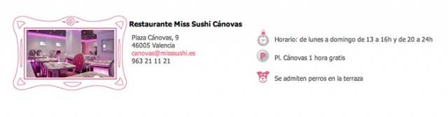Miss Sushi renueva su carta El restaurante Miss Sushi Cánovas te presenta su carta con nuevas propuestas Miss Sushi Cánovas amplia su carta, con una gran variedad de propuestas que serán auténticas delicias para tu paladar. En la renovada carta de Miss Sushi Cánovas podrás encontrar nuevos platos como la ensalada de fruta de la pasión, ensalada de medusa, japobravas o su nuevo plato en la sección “Miss Éxito”, el miss erizo, que son unos rollitos de alga nori invertido, con gamba, erizo y panceta. Si quieres ver su nueva carta, aquí te la dejamos: Miss Sushi, la cadena de restaurantes de cocina japonesa, tiñe de rosa Valencia. Frescura, creatividad y calidad definen una amplia carta con más de 300 exquisitas propuestas, en un concepto de acertada fusión gastronómica entre Oriente y Occidente. Disfruta en Miss Sushi Cánovas de uno de los mejores sushis de Valencia. Miss Sushi Cánovas está situada en la emblemática Plaza Cánovas del Castillo de Valencia, una de las plazas más míticas de la ciudad. Descubre la nueva carta de Miss Sushi Valencia y disfruta del glamour y cocina rica, saludable, a un buen precio en el ambiente más chic de Valencia.