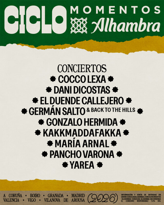 Momentos Alhambra inaugura en València su edición 2026 Valencia será la primera parada de Momentos Alhambra 2026 con los directos de Germán Salto y Back to The Hills el 10 de enero en Loco Club València vuelve a situarse en el mapa de la música en directo. Momentos Alhambra arranca su edición 2026 en la capital del Turia, convirtiéndola en el punto de partida de uno de los ciclos musicales más cuidados del panorama nacional. La cita será el sábado 10 de enero en Loco Club, donde tendrá lugar el concierto de Germán Salto y Back to The Hills en València. Una oportunidad perfecta para empezar el año disfrutando de música en directo sin prisas. Dentro del género power pop, Germán Salto se ha consolidado como una de las voces más singulares. Su música, sustentada en influencias de americana, destaca por melodías refinadas, arreglos de guitarra envolventes y una carga emocional que conecta de forma inmediata con el público. Su directo combina precisión y sensibilidad, una mezcla que encaja a la perfección con la filosofía musical del ciclo. Por su parte, Back to The Hills aporta una sonoridad que transita entre el power pop y el indie rock, con un estilo que mira al rock americano de los años 70. Su propuesta es enérgica y luminosa, marcada por melodías pegadizas y estribillos intensos, lo que convierte su concierto en una experiencia vibrante y accesible. La combinación de ambas bandas abre la edición 2026 con una noche que resume el espíritu de Momentos Alhambra: música auténtica, cuidada y pensada para disfrutarse con calma. A partir de su inicio en Valencia, el ciclo continuará por distintas ciudades españolas con una programación que reunirá a nombres tan diversos como María Arnal, que fusiona música tradicional y electrónica desde una mirada innovadora; El Duende Callejero, con su combinación de flamenco, rumba y pop; o dani dicostas, cuyo pop elegante y melódico transita entre lo confesional y lo atmosférico. También formarán parte del recorrido la banda noruega Kakkmaddafakka, conocida por sus directos luminosos y llenos de energía; el granadino Cocco Lexa, referente de la escena urbana de fusión; el pop emocional de Gonzalo Hermida; y la propuesta íntima y cuidada de Yarea. El cartel se completa con Pancho Varona, que recupera en solitario la esencia del cantautor clásico. En conjunto, el ciclo muestra la variedad y riqueza musical que caracteriza a Momentos Alhambra, una iniciativa que reúne artistas con propuestas singulares y directos llenos de matices. Programación Momentos Alhambra 2026 *AVANCE DE CARTEL Sábado 10 de enero – Germán Salto & Back to the Hills Loco Club – Valencia Viernes 27 de febrero – María Arnal Sala But – Madrid Viernes 27 de febrero – El Duende Callejero Sala El Tren – Granada Jueves 5 de marzo – Kakkmaddafakka Sala But – Madrid Martes 17 de marzo – Cocco Lexa Sala Malavida – A Coruña Sábado 28 de marzo – dani dicostas Island Club – Vigo, Pontevedra Viernes 17 de abril – Pancho Varona A Pousada da Galiza Imaxinaria – Boiro, A Coruña Sábado 18 de abril – Gonzalo Hermida Sala Malavida – A Coruña Viernes 8 de mayo – Yarea A COFRADÍA – Taberna Cultural – Vilanova de Arousa Próximamente se anunciarán más conciertos de Momentos Alhambra 2026. Toda la información en: https://www.cervezasalhambra.com/es/momentos-alhambra