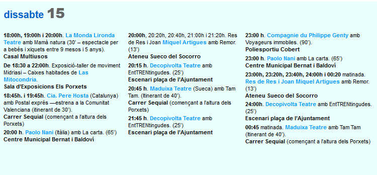 Mostra Internacional de MIM Sueca 2012 Consulta la programación de la Mostra Internacional de MIM La 23 edición de la Mostra Internacional de MIM de Sueca se celebra durante el mes de septiembre del día 12 al 16. Más de cien compañias de todo el mundo para que disfrutes de este festival dedicado a exhibir espectáculos de teatro de sala y de calle. Los espectáculos que programa MIM Sueca 2012 son teatro pantomímico grecolatino, pantomima francesa del s. XVIII, comedia dell’arte y novedosas e innovadoras propuestas teatrales con técnicas cirquenses. Programación MIM Sueca 2012 VIERNES, 14 DE SEPTIEMBRE 12:00 h. Alain Billyork (França) amb Homenatge als clàssics. (itinerant de 50’) Mercat dels Divendres. 18:30 a 22:00h. Exposició-taller de moviment Midriasi – Caixes habitades de Las Mitocondria. Sala d’Exposicions Els Porxets. 19:00h i 20:00 h. Decopivolta Teatre (València) amb EntTRENtingudes —estrena. (25’). Escenari Plaça de l’Ajuntament. 19:30 h. Alain Billyork amb Homenatge als clàssics. (itinerant de 50’). Mercat Central. 20:00h, 20:20h, 20:40h, 21:00h i 21:20h. Res de Res i Joan Miquel Artigues (Illes Balears) amb Remor —estrena a la Comunitat Valenciana. (13’). Ateneu Sueco del Socorro. 20:30 h. Visitants (Vila-real) amb Judit & Paul —estrena a la Comunitat Valenciana. (45’). Plaça de Sant Pere. 23:00 h. Compagnie du Philippe Genty (França) amb Voyageurs immobiles —estrena a la Comunitat Valenciana. (90’). Poliesportiu Cobert. 23:00 h. Gardi Hutter amb Jeanne d’Arpó. (65’). Centre Municipal Bernat i Baldoví. 23:00h, 23:20h, 23:40h, 24:00h i 00:20 matinada. Res de Res i Joan Miquel Artigues amb Remor. (13’). Ateneu Sueco del Socorro. 00:45 matinada. Visitants (Vila-real) amb Judit & Paul. (45’). Plaça de Sant Pere. SÁBADO 15 DE SEPTIEMBRE DOMINGO 16 DE SEPTIEMBRE 11:30 a 14:00h. Exposició-taller de moviment Midriasi – Caixes habitades de Las Mitocondria. Sala d’Exposicions Els Porxets. 12:00h, 13:00h, 18:00h i 19:00h. La Monda Lironda Teatre amb Mamà natura (30’). Casal Multiusos. 19:30 h. L’Associació de Professionals del Circ de la Comunitat Valenciana presenta les companyies La Bella Tour, El Fedito, Insomnia Company, Proyecto EDI [Escénico Digital Interactivo], Subcielo i Titola Teatre amb Combinat de circ (90’). Centre Municipal Bernat i Baldoví. Del 10 al 16 de setembre: Curs–Taller de moviment per a espais reduïts i d’art comunitari a càrrec d’Alicia Herrero (Xàtiva) —coreògrafa, ballarina i professora de dansa. Entradas y precios Mim Sueca 2012 Los precios de los espectáculos varían: hay entradas por 3, 4, 5, 6, 11 y 16 euros. Las entradas de MIM Sueca 2012 se pueden comprar en la taquilla del Centre Municipal Bernat i Baldoví (C/ Sant Josep, 32) de 12:00 a 14:00 h. i de 18:30 a 23:00 h. El teléfono de la taquilla es 96 170 05 15.