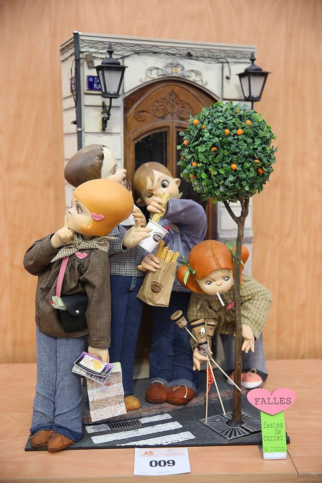 “Festes de carrer” representa a un grupo de niños en plena actividad fallera: comiendo chocolate con churros, encendiendo petardos o consultando el plano para ir a ver más fallas.