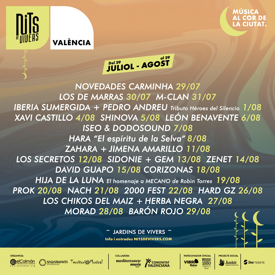 Nits de Vivers, conciertos, humor y espectáculos en las noches de verano Nits de Vivers, un nuevo ciclo de conciertos que llenará de música la ciudad de València durante el mes de agosto Agosto cuenta con una nueva cita en el calendario cultural de la ciudad de València: Nits de Vivers. Este ciclo de conciertos dará comienzo el jueves 29 de julio y se prolongará durante cinco semanas para ofrecer 21 espectáculos de géneros muy diversos en los Jardines de Viveros de la capital del Turia. De este modo, el público podrá disfrutar con propuestas de pop (Los Secretos, Zahara, Sidonie, Shinova), rock (M-Clan, León Benavente, Corizonas, Novedades Carminha, Los de Marras), rap y música urbana (Nach, Los Chikos del Maíz, Prok, Morad, Iseo & Dodosound) y una noche dedicada a la música electrónica de baile de la primera década de los 2000. También actuarán dos monologuistas (Xavi Castillo i David Guapo). Uno de los 8 planes para disfrutar de agosto en València. Nits de Vivers es una iniciativa de varias empresas promotoras musicales locales que nace con el objetivo de incentivar la recuperación del tejido social y cultural de València ante las consecuencias de la Covid-19. Asimismo, la programación está destinada a enriquecer la oferta turística de la ciudad con una programación cultural variada y de calidad. Los conciertos se desarrollarán en un espacio al aire libre que tiene unas dimensiones ideales para el cumplimiento de las medidas de seguridad frente la pandemia, y el recinto dispondrá de servicios de gastronomía y parking de bicicletas. Este nuevo festival está integrado en la marca Mediterranew Musix que promueve Turisme Comunitat Valenciana y cuenta con al patrocinio de Vibra Mahou, la plataforma de música de Mahou Cinco Estrellas que se suma a la celebración con el objetivo de seguir apostando por crear nuevas experiencias y generar encuentros de calidad en torno a la música en directo, con Revive Vivers. Un proyecto solidario de inserción social y laboral Asimismo, el ciclo nace con una clara voluntad solidaria gracias a la colaboración de la Associació Àmbit y sus actividades de inserción social y laboral. Concretamente, los conciertos darán apoyo el proyecto Rebrot que apuesta por la agricultura social para la reinserción de personas en situación de vulnerabilidad. La programación de Nits de Vivers Las entradas para todos los conciertos y espectáculo de Nits de Vivers se pueden comprar a través de la página www.nitsdevivers.com.