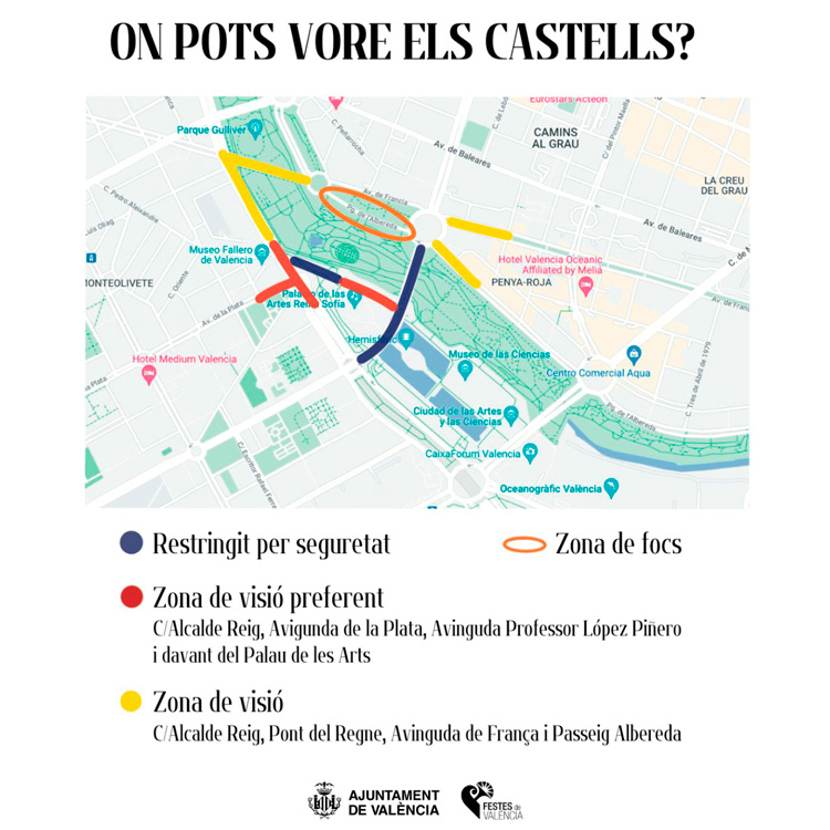 Nueva ubicación de los Castillos de Fallas 2023 Los Castillos de fuegos artificiales de las Fallas 2023 se disparan desde una nueva ubicación y horario. Consulta desde dónde ver los Castillos de Fallas de Valencia ¡València ya está en Fallas! Del 16 al 19 de marzo se celebran los tradicionales Castillos de Fallas, pero este año lo harán en una nueva ubicación y horario. Los castillos de fuegos artificiales de las Fallas 2023 se dispararán en la parte de atrás del Palau de les Arts, abandonando la zona del antiguo cauce del río Turia donde se solía disparar (entre el Puente de las Flores y el Puente de la Exposición). Esta decisión que comunicó la Concejalía de Cultura Festiva del Ayuntamiento de Valencia, es fruto de la búsqueda de un espacio más adecuado que el río para los disparos. La nueva ubicación se considera un lugar “emblemático, más descentralizado, con buena accesibilidad y que la gente conoce” ha comentado el edil Carlos Galiana. De esta manera los Castillos de Fallas tendrán una mejor visibilidad y más posibilidades creativas y artísticas. El jueves 16 de marzo, la ciudad despierta con la Plantà de todas las fallas, después la mascletà aprovechando los días de sol, terracita y buen tiempo; y por la tarde veredicto de los premios de las Fallas 2023. Para finalizar el programa del jueves 16 de marzo, arrancan los Castillos de Fallas y los más fiesteros, pueden seguir la fiesta en las verbenas falleras. Castillos de Fallas 2023 Los días grandes de las Fallas habrá 3 espectáculos pirotécnicos nocturnos que se podrán disfrutar y que llenarán el cielo de València de color, luz y color. Castillo de Fallas el jueves 16 de marzo Pirotecnia: Pirotecnia Aitana Hora: 00:30h Ubicación: Paseo de la Alameda (zona Palau de les Arts) Castillo de Fallas el viernes 17 de marzo Pirotecnia: Pirotecnia Hermanos Caballer Hora: 01:00h Ubicación: Paseo de la Alameda (zona Palau de les Arts) Castillo de Fallas el sábado 18 de marzo El último castillo de las Fallas se celebra la Nit del Foc Pirotecnia: Pirotecnia del Mediterráneo Hora: 01:00h Ubicación: Paseo de la Alameda (zona Palau de les Arts) Dónde ver los nuevos Castillos de Fallas A continuación puedes ver los mejores lugares para ver los castillos de las Fallas de València: Zona de visión preferente: Calle Alcalde Reig, Avenida de la Plata, Avenida Profesor López Piñero y delante del Palau de les Arts. Zona de visión: Calle Alcalde Reig, Puente del Regne, Avenida de Francia y Paseo de la Alameda Consulta el resto del programa de Fallas 2023 y disfruta de la semana grande de las fiestas josefinas.