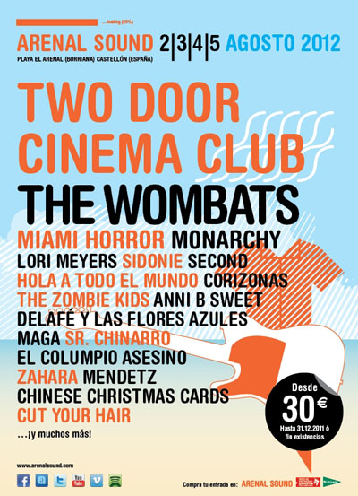 Nuevos grupos se apuntan al festival Arenal Sound El festival Arenal Sound 2012 confirma la asistencia de nueve bandas nacionales y dos internacionales más El Festival Arenal Sound 2012 que tendrá lugar en la playa de Burriana, Castellón, del 2 al 5 de agosto cuenta con nueve bandas nacionales y dos bandas internacionales más. El festival de música pop, rock, indie y electrónica suma a su larga lista de grupos ya confirmados a Miami Horror, Monarchy, Second, Hola a todo el mundo, Maga, Sr.Chinarro, El columpio asesino, Zahara, Mendetz, Chinese Christmas cards y Cut Your Hair. Los asistentes al festival disfrutarán durante cuatro días de la música de más de 80 artistas, dos fiestas de bienvenida y fiestas en barco incluidas en el abono con piscina, actividades deportivas y zona de acampada mejorada. Grupos como The Wombats, Two Door Cinema Club, Lori Meyers, Sidonie, Corizonas, The Zombie Kids, Anni B.Sweet, Delafé y las Flores Azules ya han dado el “sí quiero” al Festival Arenal Sound 2012. Las entradas pueden ser adquiridas desde 30€ hasta el 31 de diciembre o hasta fin de existencias en arenalsound.com, atrapalo.com y el Corte Inglés. Más información en www.arenalsound.com