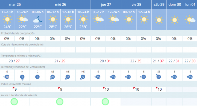 Ola de calor en València València se prepara para vivir la primera ola de calor de verano La Agencia Estatal de Meteorología (Aemet) informa de que la ola de calor llegará mañana miércoles 26 de junio y permanecerá en la Península y Baleares, al menos hasta el lunes 1 de julio. El verano empieza fuerte en la Comunidad Valenciana, que activará mañana el nivel naranja. Esta ola de calor se debe a la llegada de una masa de aire tropical continental que llega a España después de un extenso recorrido por el norte de África y se caracteriza por ser muy cálida, muy seca y con polvo en suspensión. Todo ello, junto con la fuerte insolación propia de estas fechas, dará lugar a un largo periodo en el que las temperaturas alcanzarán valores significativamente altos. València alcanzará su punto más álgido el sábado 29 de junio, con hasta 37 grados, mientras que en Xàtiva, Aliza y Requena se espera que superen los 40 grados. Con estas altas temperaturas se recomienda seguir los consejos para combatir el calor y evitar las horas de mayor exposición al sol. Por delante se presenta una semana muy cálida. A mitad de semana las altas temperaturas comenzarán a afectar al interior y el calor se generalizará en todo el territorio a partir del viernes. Previsiblemente el sábado será el día más cálido. pic.twitter.com/s3iA2Qljcu — AEMET_C. Valenciana (@AEMET_CValencia) 24 de junio de 2019 El tiempo en Valencia durante la ola de calor