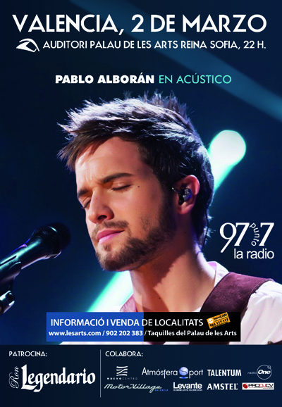 Pablo Alborán en concierto en el Palau de les Arts de Valencia Pablo Alborán actúa el 2 de marzo en el Palau de les Arts El concierto de Pablo Alborán en Valencia será en el Palau de les Arts. El próximo 2 de marzo el cantante dará un concierto a las 22:00 horas. Pablo Alborán ya actúo en Valencia en la Feria de Julio 2011. Entradas Concierto Pablo Alborán Pablo Alborán actúa en un escenario que hasta ahora estaba destinado a otro tipo de interpretaciones. Las entradas se podrán comprar en el mismo Palau de les Arts desde el viernes 3 de febrero. El precio de las entradas será a partir de 25 euros.