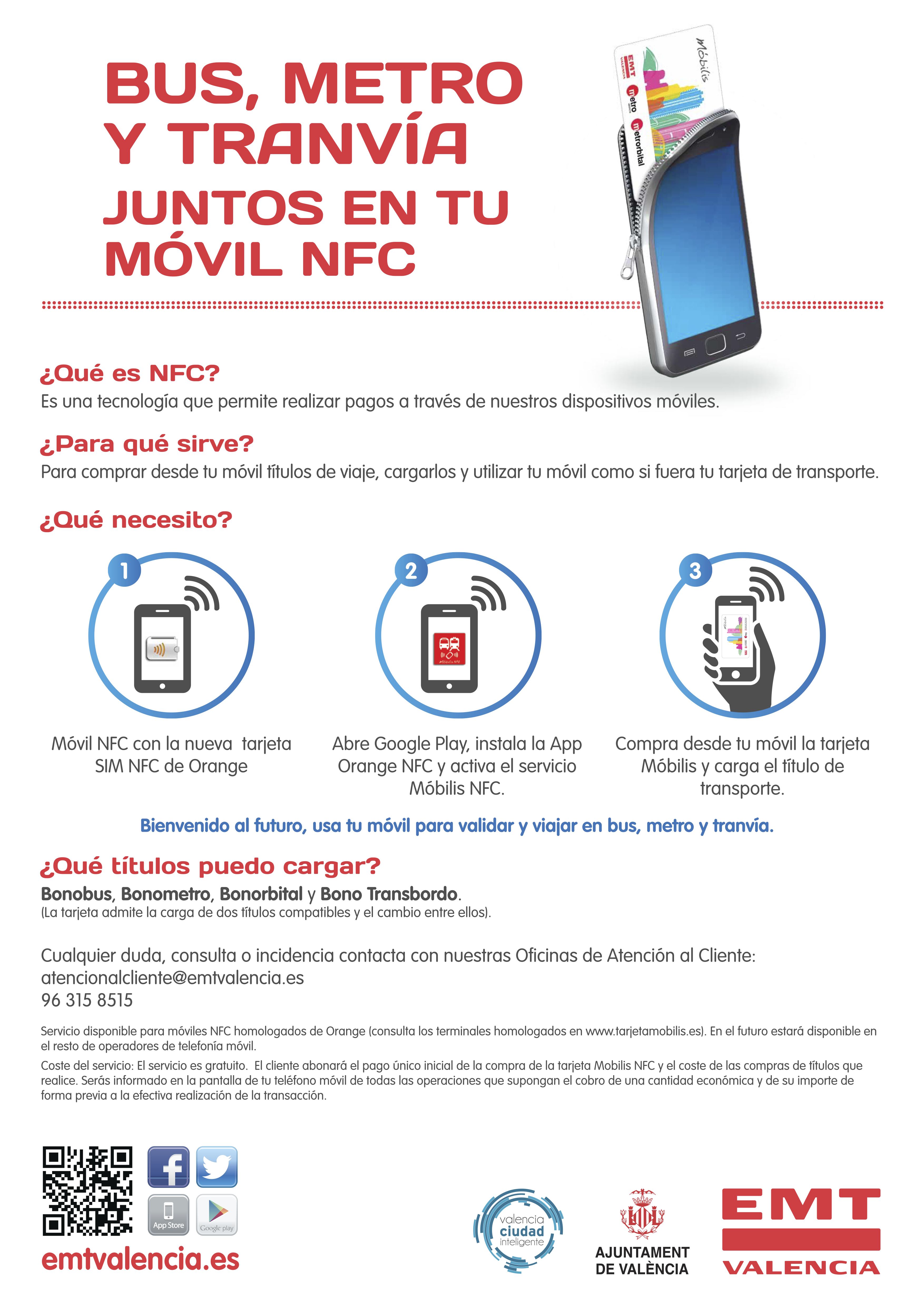 Pagar bus, metro y tranvía con el móvil Los ususarios de EMT, metro y tranvía ya pueden pagar sus billetes con el móvil Los usuarios del transporte público de Valencia están de enhorabuena, ya pueden comenzar a pagar sus billetes con el móvil. Para ello deben descargarse la aplicación de Móbilis. Pueden acceder a este servicio los viajeros que tengan un teléfono móvil con tecnología NFC Ornage. Para ello se debe comprar una tarjeta SIM NFC en una tienda Orange, cuesta 5 euros, y descargar la aplicación de Móbilis, de forma gratuita. De esta forma podrán cargar con el teléfono sus billetes. La idea es que pronto se extienda a otros modelos y operadores. Bienvenido al futuro