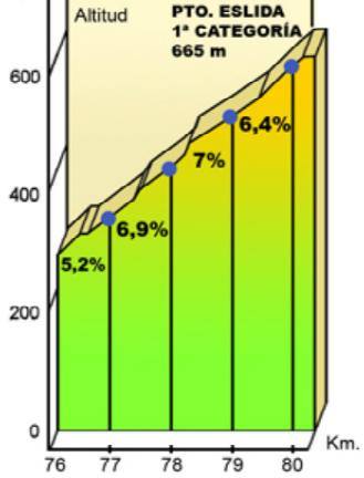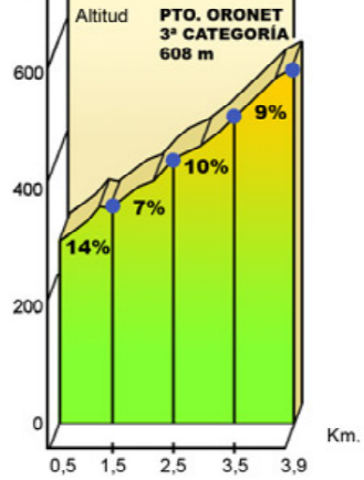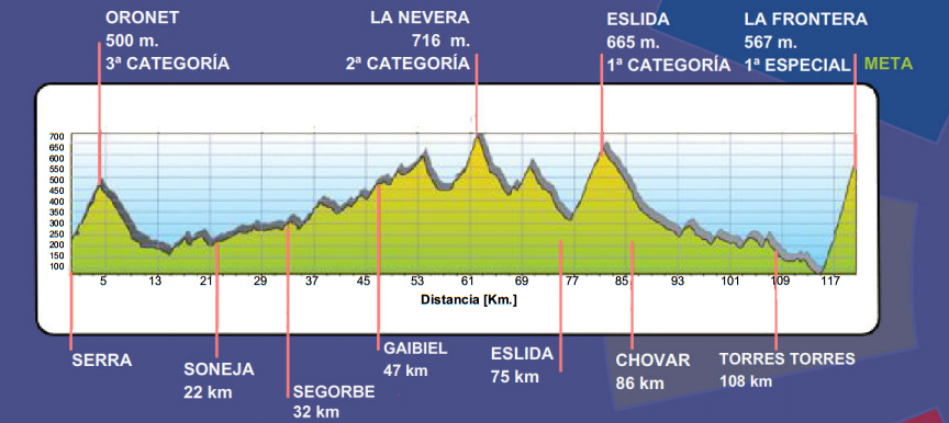 Perfiles de la ruta 4 Puertos Serra Tot Natura Estos son los perfiles de la Marcha Cicloturista 4 Puertos Serra Tot Natura. Los puertos que componen la Marcha Cicloturista 4 Puertos Serra Tot Natura son los siguientes: Puerto Oronet: 3ª categoría, 608 metros de altitud. Puerto La Nevera: 2ª categoría, 716 metros de altitud. Puerto Eslida: 1ª categoría, 665 metros de altitud. Puerto La frontera: 1ª categoría especial, 567 metros de altitud.
