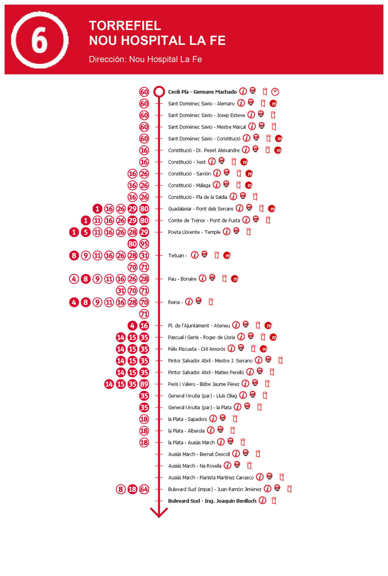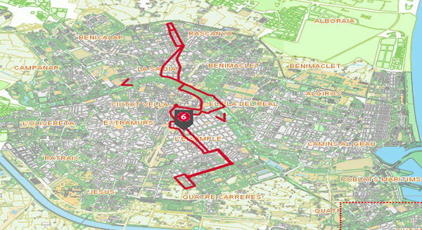 Línea 6 autobuses Valencia Linea 6 VER AQUI PLANO PARADAS L6>> VER AQUI HORARIOS PARADAS L6>> Si coges la línea 6 de autobuses de Valencia, pasarás cerca de los siguientes teatros: - Sala Matilde Salvador - Teatre Rialto - Teatro Moratin. - Teatro Olympia - Teatro Principal Monumentos y lugares de interés: - Antigua estación de trenes - Centro Cultural Fundación Bancaja - Colegio Oficial de Médicos de Valencia - El Miguelete y el Micalet. Museos: - Casa Museo Concha Piquer - Museo Casa de las Rocas - Museo de Historia de la Medicina - Museo de la Catedral - Museo del Palacio de Cervello - Museo del Patriarca Ver todas las líneas de la EMT