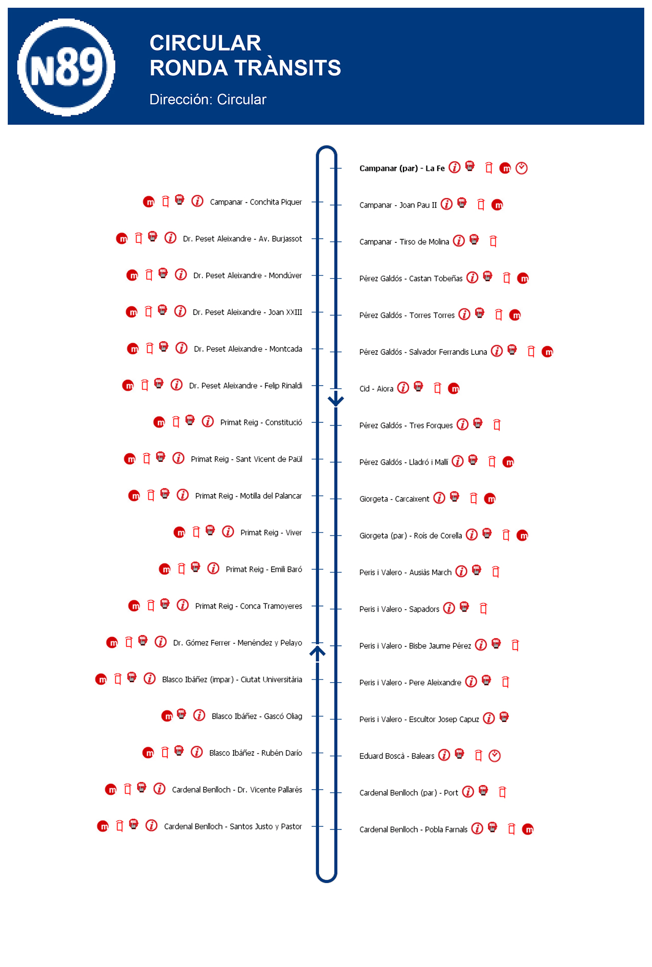 Línea N89 autobuses Valencia Linea N89 VER AQUI PLANO PARADAS LÍNEA N89>> VER AQUI HORARIOS PARADAS LÍNEA N89>> Ver todas las líneas de la EMT