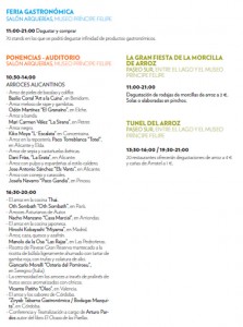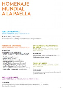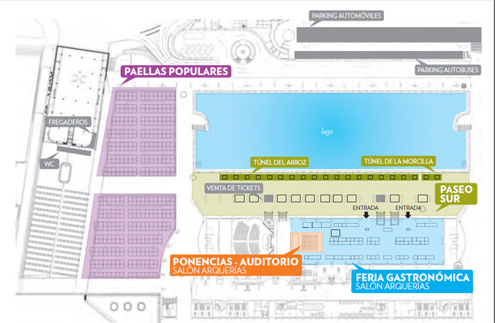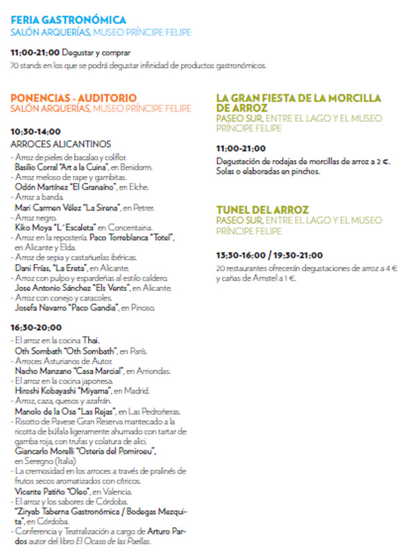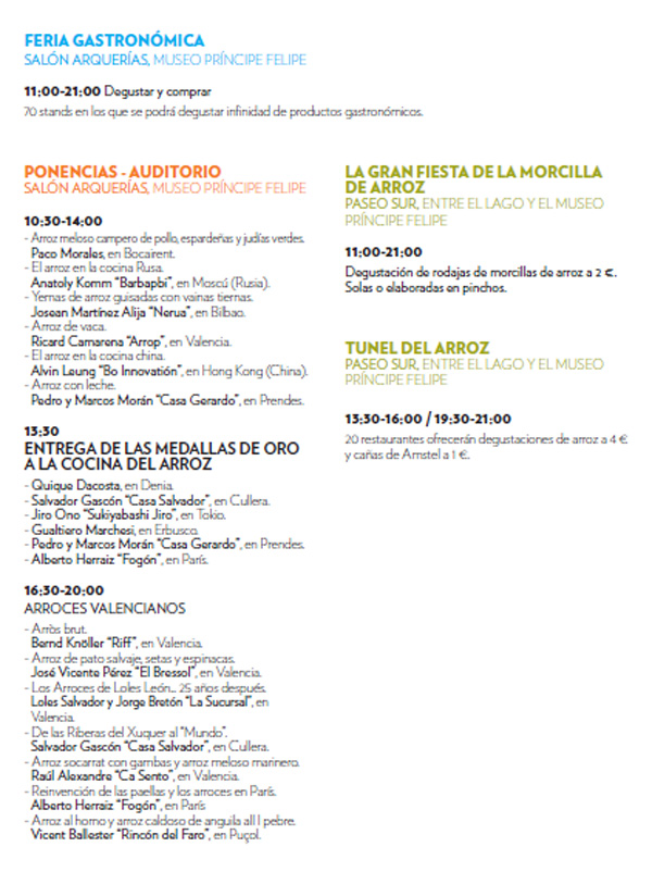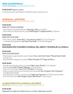 Programa I Congreso Mundial del Arroz Valencia 2011 Las actividades del Congreso Mundial del Arroz 2011 del 29 de septiembre al 2 de octubre El I Congreso Mundial del Arroz – Homenaje a la Paella 2011 se celebra del 29 de septiembre al 2 de octubre en la Ciudad de las Artes y las Ciencias. Cuatro jornadas con profesionales reconocidos y conferencias que abordarán los diferentes tipos de arroz. Además, durante todos los días se podrá disfrutar de degustaciones gastronómicas. Jueves 29 de septiembre Programa completo 29 de septiembre FERIA GASTRONÓMICA (Salón Arquerías. Museo Príncipe Felipe): De 11:00 a 21:00 horas: Degustar y comprar. 70 stands de productos gastronómicos. LA GRAN FIESTA DE LA MORCILLA DE ARROZ (Paseo Sur, entre el lago y el Museo Príncipe Felipe). 11:00 – 21:00 horas. Degustaciones a 2 euros. PONENCIAS DEL CONGRESO DEL ARROZ (Auditorio Museo Príncipe Felipe) 11:00 – 12:00 horas. Arroces castellonenses. 12:00 – 13:00 horas. Arroces catalanes. 13:00 – 13:15 horas. Inaguración I Congreso Mundial del Arroz – Homenaje a la Paella 2011. 13:15 – 14:00 horas. Arroces murcianos. 16:30 – 20:00 horas. Arroces del mundo. Viernes 30 de septiembre Programa completo 30 de septiembre FERIA GASTRONÓMICA (Salón Arquerías. Museo Príncipe Felipe): De 11:00 a 21:00 horas: Degustar y comprar. 70 stands de productos gastronómicos. TÚNEL DEL ARROZ (Paseo Sur, entre el lago y el Museo Príncipe Felipe). 13:30 – 16:00 horas y 19:30 – 21:00 horas. Degustaciones de arroz a 4 euros y cañas a 1 euro. LA GRAN FIESTA DE LA MORCILLA DE ARROZ (Paseo Sur, entre el lago y el Museo Príncipe Felipe). 11:00 – 21:00 horas. Degustaciones a 2 euros. PONENCIAS DEL CONGRESO DEL ARROZ (Auditorio Museo Príncipe Felipe) 10:30 – 14:00 horas. Arroces alicantinos. 16:30 – 20:00 horas. Arroces del mundo. Sábado 1 de octubre Programa completo 1 de octubre FERIA GASTRONÓMICA (Salón Arquerías. Museo Príncipe Felipe): De 11:00 a 21:00 horas: Degustar y comprar. 70 stands de productos gastronómicos. TÚNEL DEL ARROZ (Paseo Sur, entre el lago y el Museo Príncipe Felipe). 13:30 – 16:00 horas y 19:30 – 21:00 horas. Degustaciones de arroz a 4 euros y cañas a 1 euro. LA GRAN FIESTA DE LA MORCILLA DE ARROZ (Paseo Sur, entre el lago y el Museo Príncipe Felipe). 11:00 – 21:00 horas. Degustaciones a 2 euros. PONENCIAS DEL CONGRESO DEL ARROZ (Auditorio Museo Príncipe Felipe) 10:30 – 14:00 horas. Arroces del mundo. 13:30 horas. Entrega de las Medallas de Oro a la Cocina del Arroz. 16:30 – 20:00 horas. Arroces valencianos. Domingo 2 de octubre Programa completo 2 de octubre FERIA GASTRONÓMICA (Salón Arquerías. Museo Príncipe Felipe): De 11:00 a 16:00 horas: Degustar y comprar. 70 stands de productos gastronómicos. TÚNEL DEL ARROZ (Paseo Sur, entre el lago y el Museo Príncipe Felipe). 13:30 – 16:00 horas. Degustaciones de arroz a 4 euros y cañas a 1 euro. LA GRAN FIESTA DE LA MORCILLA DE ARROZ (Paseo Sur, entre el lago y el Museo Príncipe Felipe). 11:00 – 16:00 horas. Degustaciones a 2 euros. PAELLAS POPULARES (Láminas de Agua, junto al Puente L’Assut de L’Or) 13:30 a 16:00 horas. Se elaborarán y degustarán paellas realizadas por fallas, asociaciones de hosteleros o centros de formación. Se requiete ticket-invitación.