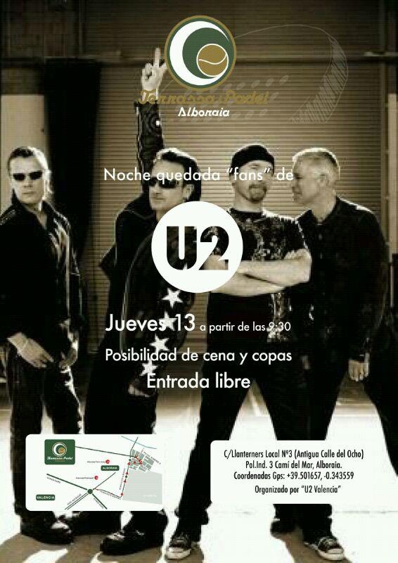 La cita es en Terrassaipadel Alboraia, y la reunión comenzará a partir de las 21:30 horas, para pasar un rato agradable con los miembros de U2 Valencia. Videos musicales, cena anti-crisis y copas a buen precio para despedir el verano, con nuestro grupo favorito como gran anfitrion, “U2”.
