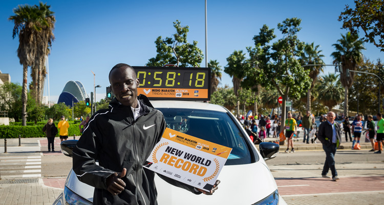 Récord del mundo en el Medio Maratón Valencia Abraham Kiptum bate el récord del mundo del Medio Maratón con una marca de 58:18 en el Medio Maratón Valencia Valencia es la ciudad de los récord del medio maratón. Al récord del mundo femenino del año pasado de Jepkosgei (1h04:51) y el récord femenino en un Mundial (Gudeta, 1h06:11), logrado en el pasado Campenato del Mundo de Media Maratón Valencia 2018, se une ahora la espectacular marca de Abraham Kiptum, que con su tiempo de 58:18, supone el mejor registro histórico internacional en la distancia de 21.097,5 metros tras superar el anterior récord de Zersenay Tadese (58:23, Lisboa 2010). Tres récords del mundo en apenas doce meses. ¡Un nuevo récord de deporte en Valencia! Paco Borao, presidente de la SD Correcaminos, organizadora del Medio Maratón Valencia Trinidad Alfonso EDP, compareció en la rueda de prensa de ganadores asegurando que “para el año que viene, queremos más y mejor. Seguir mejorando los marcas y seguir convenciendo a más corredores de que el Medio Maratón Valencia es la carrera que deben coger”. “Vamos a intentar los récords del Maratón, pero no este año, dejadnos que lo preparemos bien el próximo año”, reconoció Paco Borao. Abraham Kiptum, vencedor de la prueba y nuevo récordman mundial en la distancia, aseguró que “estoy muy feliz por la victoria. Me encontraba bien en el kilómetro 15 y pensé ‘¿por qué no intentarlo?’. Es un circuito muy rápido y lo he querido aprovechar”. El Medio Maratón Valencia estrenaba circuito y el rápido trazado permitió a ocho corredores entrar en meta por debajo de la hora, un registro que el mejor Medio Maratón de España lleva celebrando ocho años seguidos. Los tres primeros han entrado con marcas por debajo del anterior récord de la prueba 58:48, que poseía Cheroben (quien se retiró este año) ya que además del triunfo de Kiptum completaron el podium Yemal Yimer (58:33) y Hadis Embaye (58:44).