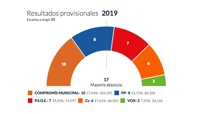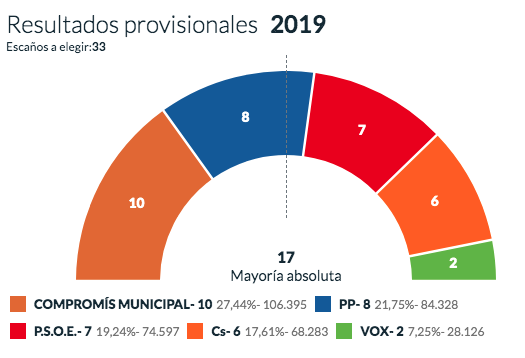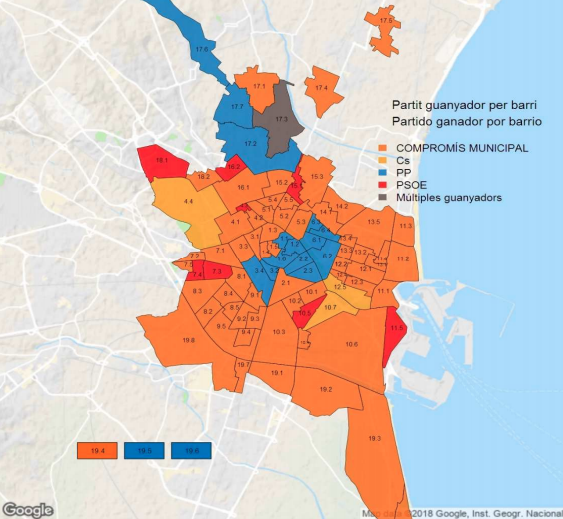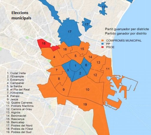 Resultado de las elecciones municipales en València Las elecciones municipales 2019 revalidan a Compromís, con Joan Ribó como alcalde de València, con el apoyo del PSPV-PSOE Ya se conocen los resultados con el 100% escrutado de las elecciones municipales celebradas el domingo 26 de mayo. El partido más votado en València es Compromís con el 27,44% de los votos y 10 concejales, uno más que en las últimas elecciones. Por su parte, el Partido Popular que en 2015 fue el partido más votado con 10 concejales, tendrá durante los próximos cuatro años 8 concejales. El PSPV-PSOE aumenta dos concejales y consigue 7 concejales en el Ayuntamiento de València, mientras que Ciudadanos se mantiene con 6 ediles en València. Unides Podem que en la anterior candidatura se presentó como València en Comú (VALC) pierde 3 concejales y se queda sin representación; al contrario que VOX que entra en el consistorio con 2 concejales por primera vez en la capital de la Comunitat Valenciana. Para gobernar se necesita mayoría absoluta con 17 concejales y Joan Ribó de Compromís (10 concejales) con el apoyo de PSPV-PSOE (7 concejales) revalida la alcaldía de València. Datos de las elecciones municipales 2019 en Valencia Total votantes 389.077 – 66,32% Abstención 197.546 – 33,68% Votos en blanco 1.526 – 0,39% Votos nulos 1.369 – 0,35% La Oficina de Estadística del Ayuntamiento de Valencia ha publicado un dossier con la información por barrios de las elecciones celebradas en mayo 2019. Puedes consultar todos los datos en la web http://www.valencia.es/estadistica Resultados por barrios de València Resultados por distritos de València A continuación se muestran los datos obtenidos en los barrios de València, con la candidatura más votada y el número de votos. Distrito Escrutado Candidatura más votada Votos Algiros 100% COMPROMÍS MUNICIPAL 6.053 30,41% Benicalap 100% COMPROMÍS MUNICIPAL 5.531 27,02% Benimaclet 100% COMPROMÍS MUNICIPAL 4.755 31,03% Camins al Grao 100% COMPROMÍS MUNICIPAL 8.321 27,51% Campanar 100% COMPROMÍS MUNICIPAL 5.188 27,48% Ciutat Vella 100% PP 4.028 28,53% Cuatre Carreres 100% COMPROMÍS MUNICIPAL 9.299 27,51% Extramurs 100% PP 7.343 27,50% Jesús 100% COMPROMÍS MUNICIPAL 7.409 29,61% L’Eixampla 100% PP 7.662 31,57% Olivereta 100% COMPROMÍS MUNICIPAL 5.726 26,49% Patraix 100% COMPROMÍS MUNICIPAL 9.600 31,33% Pla del Real 100% PP 6.141 35,82% Pobl. del Nord 100% PP 1.010 28,91% Pobl. Maritims 100% COMPROMÍS MUNICIPAL 7.180 29,66% Poblats del Sud 100% COMPROMÍS MUNICIPAL 2.881 29,34% Poblats Oest 100% P.S.O.E. 1.930 30,86% Rascanya 100% COMPROMÍS MUNICIPAL 5.999 26,63% Zaidia 100% COMPROMÍS MUNICIPAL 6.851 29,45% València 100% COMPROMÍS MUNICIPAL 106.395 27,44% Puedes consultar el resto de resultados en la web oficial del Ministerio del Interior.