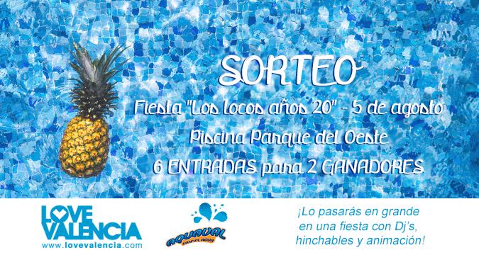 Sorteo de entradas para la Fiesta Locos Años 20 en la Piscina Parque del Oeste Participa en el sorteo de dos entradas triples para la fiesta nocturna que se celebra en la Piscina Parque del Oeste el viernes 5 de agosto, con la temática "Locos Años 20". ¡Lo disfrutarás! La Piscina Parque del Oeste organiza todos los viernes de julio y agosto fiestas nocturnas tamáticas que empiezan a las 21:00h y acaban a la 1:00h de la madrugada, con DJ’s, cocktails, colchonetas y animación para los más pequeños. En Love Valencia sorteamos dos entradas triples para la fiesta “Los Locos Años 20” que se celebra el 5 de agosto, con la música de Swingin’ Party, hinchables, Paddle Surf, DJ residente y animaciones. Puedes participar en el sorteo a través de nuestras redes sociales, Facebook y Twitter. ¿Quieres saber cómo? Consulta abajo: Cómo participar en el sorteo de entradas para la fiesta nocturna en la piscina Parque del Oeste: Facebook Sigue la página de Facebook de Love Valencia. Dale “Me Gusta” a la publicación del sorteo Comparte de forma pública la publicación del sorteo. Déjanos un comentario y cuéntanos a quién te llevarías a esta fiesta. Twitter Síguenos en el Twitter de Love Valencia. Retuitea el tuit del sorteo que hemos publicado Habrá dos ganadores, uno que haya participado por Facebook y otro que haya participado por Twitter. Cada ganador se llevará 3 entradas para la fiesta “Los Locos Años 20” en la Piscina Parque del Oeste, que podrá recoger en taquilla enseñando su DNI. El sorteo empieza el viernes 29 de julio a las 12:00h y se cierra el lunes 1 de agosto a las 12:00h. Ese lunes a lo largo de la mañana anunciaremos los dos ganadores. Consulta las bases del sorteo de entradas para la Fiesta Locos Años 20 en la Piscina Parque del Oeste si tienes cualquier duda. Anímate a participar y refréscate al ritmo de la fiesta más divertida.