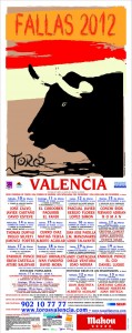 Toros Feria de Fallas 2012 Durante las Fallas de 2012 se celebra la Feria de Fallas en la Plaza de Toros. La información sobre la Feria de Fallas 2012 es la siguiente: Sábado 10 de marzo Toros de Adolfo Martín para José Calvo, Javier Castaño y David Esteve. Domingo, 11 de marzo Toros de Jandilla para Manuel Díaz ‘El Cordobés’, Francisco Rivera ‘Paquirri’ y David Fandila ‘El Fandi’. Lunes 12 de marzo Novillos de Javier Molina para el mexicano Sergio Flores, López Simón y Pascual Javier. Martes 13 de marzo Novillos de El Parralejo para Conchi Ríos, Fernando Adrián y Román Collado. Miércoles 14 de marzo Toros de Valdefresno para el francés Thomas Duffau, el mexicano Diego Silveti y Jiménez Fortes. Jueves 15 de marzo Toros de Alcurrucén para Curro Díaz, Matías Tejela y Alberto Aguilar. Viernes 16 de marzo Toros de Garcigrande para Juan José Padilla, José María Manzanares y Alejandro Talavante. Sábado 17 de marzo Toros de Zalduendo para Enrique Ponce, Sebastián Castella y Arturo Saldívar. Domingo 18 de marzo Toros de Fuente Ymbro para Diego Urdiales, Iván Fandiño y David Mora. Lunes 19 de marzo (matinal) Rejones. Toros de Fermín Bohórquez para Andy Cartagena, Diego Ventura y Joao Moura. Lunes 19 de marzo (tarde) Toros de la familia de Niño de la Capea para Enrique Ponce, ‘El Cid’ y Daniel Luque. Más información Fallas 2012
