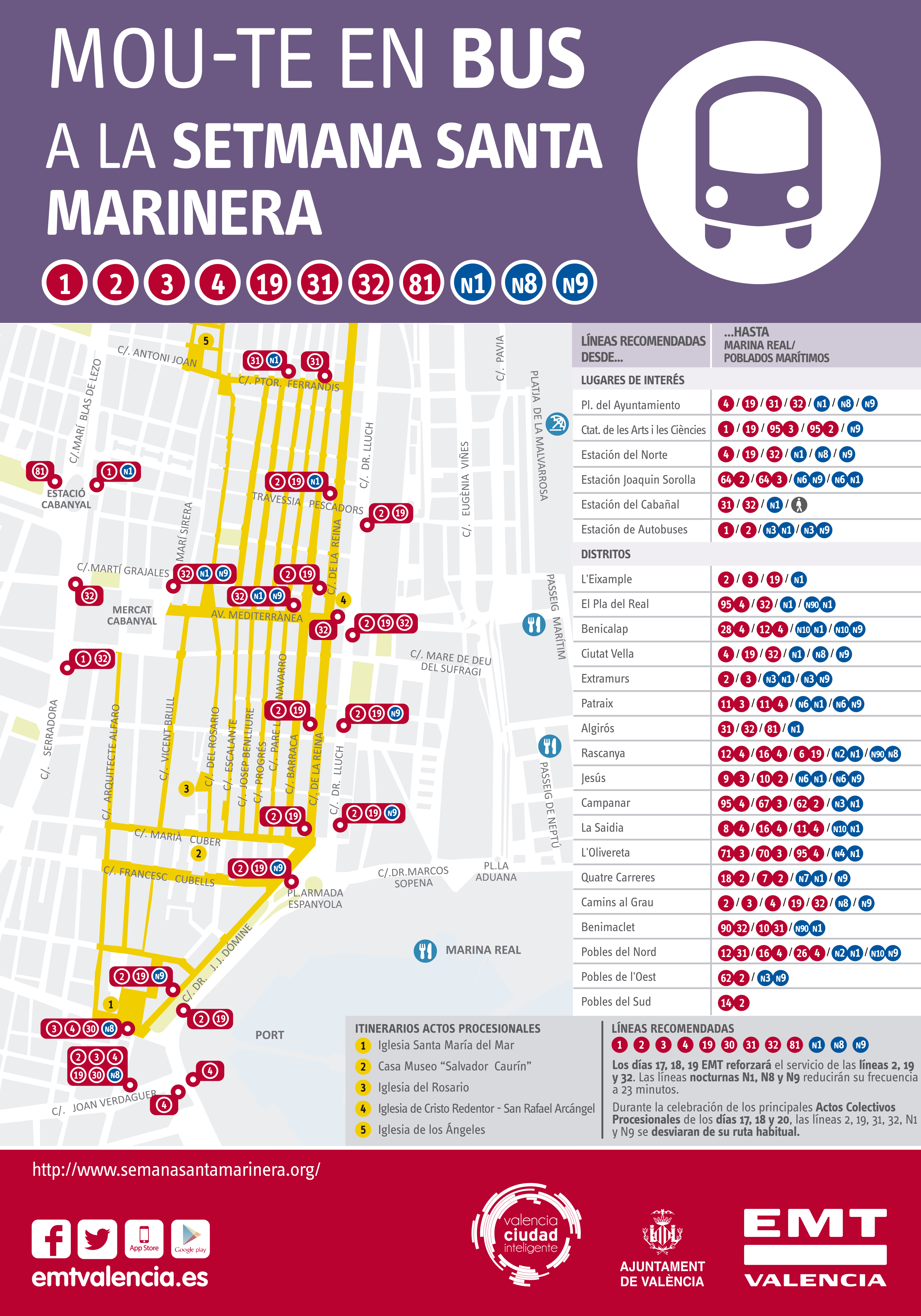 Transporte EMT Semana Santa 2104 La EMT aplica refuerzos de hasta el 35 por ciento para ofrecer mayor cobertura de servicio a la Semana Santa Marinera 2014 La celebración de la Semana Santa Marinera 2014 tiene un fuerte arraigo en la ciudad de Valencia, especialmente en la zona marítima de la ciudad, donde tienen lugar solemnes y vistosas procesiones, declaradas Fiesta de Interés Turístico Nacional. Con motivo de facilitar a los ciudadanos y visitantes la posibilidad de acudir a esta cita tan tradicional, la Empresa Municipal de Transportes de Valencia (EMT), aplica importantes refuerzos en diversas líneas durante estas celebraciones, que van desde es 10 al 20 de abril, ambos inclusive. Para el Jueves Santo (jueves 17), día en que se intensifican los actos y procesiones, la entidad aplicará refuerzos de hasta un 25% en las líneas: 2 ‘La Malva·rosa – Campanar’ 19 ‘La Malva·rosa/Marina Real – Pl. l’Ajuntament’ El Viernes Santo,( 18 de abril) consciente de que se trata de un día festivo en la ciudad, EMT intensificará el servicio en un 30% en las líneas : 2 19 32 ‘Passeig Marítim – Marqués de Sotelo’ 35 ‘Pl. l’Ajuntament –Ctat. Arts i Ciències/I. Canàries’ y 95 ‘Hosp. General/Parc Capçalera – Ctat. Arts i Ciències’ Todo ello, se complementará con el servicio de la red nocturna, los días: miércoles 16, jueves 17 como el viernes 18, en las líneas: N1 ‘Pl. l’Ajuntament – B.Ibáñez/La Malva·rosa’, N8 ‘Pl. l’Ajuntament – Av.Port/Natzaret’ N9 ‘Pl. l’Ajuntament – Mont·Olivet/Cabanyal’ duplican su oferta de servicio, y mejoran sus frecuencias de paso hasta los 23 minutos. El Sábado Santo como el Domingo de Resurrección, los aumentos de EMT alcanzan el 35% en las líneas: 2, 19, 32, 35 y 95, para que valencianos y visitantes puedan vivir en directo la solemnidad y atractivo de los actos organizados por la Semana Santa Marinera 2014. Miércoles 16 de abril: Copa del Rey, Paellas universitarias y Pascua El miércoles 16 de abril, coincide con la celebración de la final de la Copa del Rey en Mestalla, para lo que EMT ha preparado una serie de servicios especiales para los aficionados de cada equipo. Además, ese mismo día tiene lugar una de las fiestas más esperadas por los estudiantes valencianos, las paellas universitarias junto a la antigua Estación del Grao, para lo que la entidad aumenta el servicio en un 30% de las líneas 2, 3, 4, 19 y 30, que pasan cerca del entorno donde se celebra esta fiesta juvenil. En la celebración de la Semana Santa Marinera 2014 , son muchos los turistas que vienen a Valencia; para aprovechar estos días conociendo los principales puntos y monumentos más importantes de la ciudad. Para ellos, EMT mantendrá refuerzos del 35% en dos de sus líneas más turísticas: el 35 y el 95, los días: el lunes 21 sábado 26 domingo 27 lunes 28 *Trasládate a los puntos de interés de una forma cómoda, segura y rápida; no dudes en desplazarte en Transporte público en Valencia.