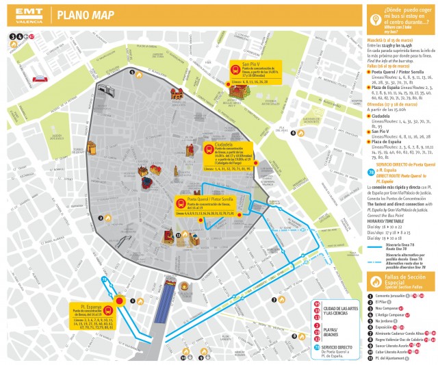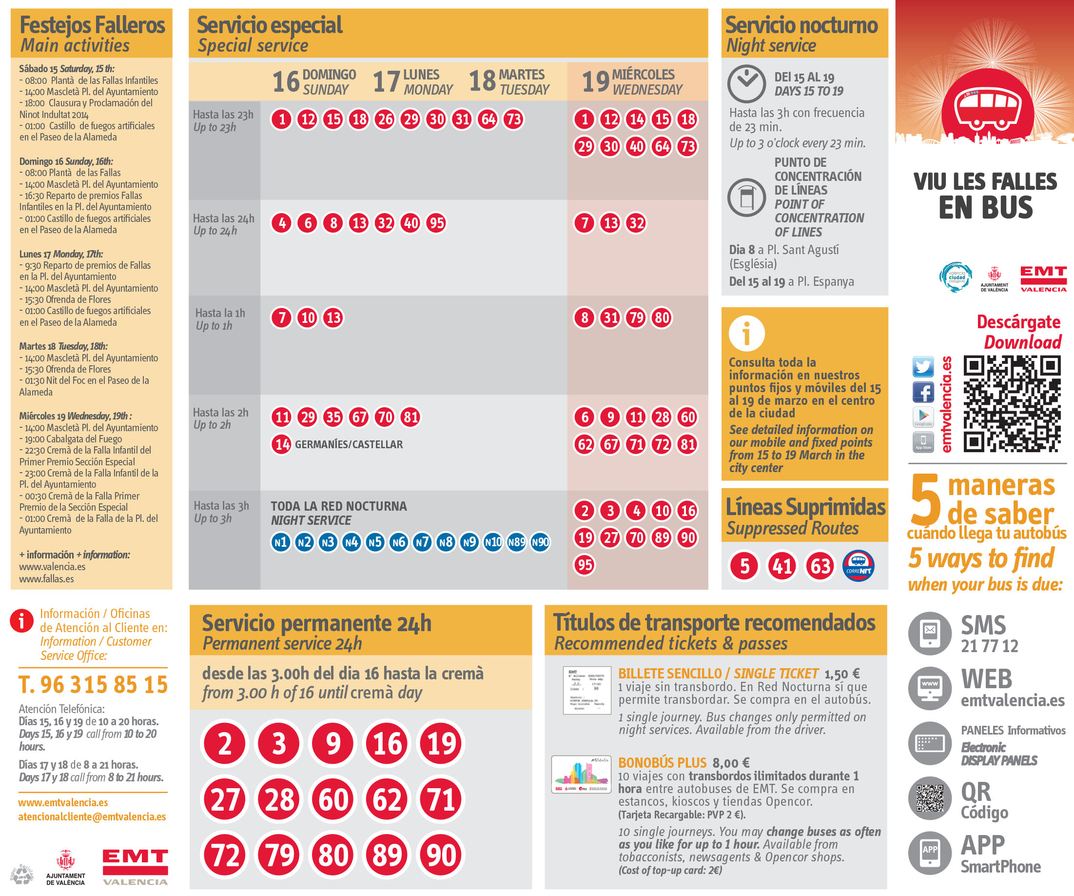 Transporte Especial de EMT en las Fallas 2014 EMT pone al servicio de los usuarios 15 líneas con servicio 24 horas, para los días grandes de Fallas 2014 EMT Valencia pone a disposición de los usuarios un servicio especial para los días 16, 17, 18 y 19 de marzo, los días grandes de las Fallas 2014. Para facilitar llegar a los puntos de interés una de las mejores opciones es moverse en autobús en fallas. Se ofertan 3, 5 millones de plazas, y un servicio ininterrumpido a partir de la “Nit de la Plantà” hasta la madrugada del 20 de marzo. Para moverse en autobús en fallas, los usuarios dispondrán de 15 líneas con servicio 24 horas, y otras 25 líneas que alargan su duración; además las 12 líneas nocturnas duplican su servicio. Y para facilitar cruzar la ciudad de manera rápida, EMT Valencia ha establecido una Línea de Servicio Directo (SD) enlazando líneas del norte y este de la ciudad, con las que llegan del sur y oeste Para visitar fallas, vivir la fiesta en las calles y llegar a los eventos más destacados, no lo dudes, la alternativa más efectiva es moverse en autobús en fallas. Servicios especiales Fallas 2014 “Viu Les Falles en Bus”