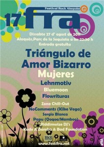Triangulo de Amor Bizarro y Mujeres en FRA 2011 Alaquàs El FRA 2011 se celebra el 27 de agosto con Triangulo de Amor Bizarro El 27 de agosto se celebra el Festival de Rock de Alaquàs 2011. Triangulo de Amor Bizarro, Mujeres, Lehnmotiv, Bluemoon y Flowrituras actuarán en el Parque de la Sequieta de Alaquàs a las 22:30 horas. La entrada es gratuita. También habrá una zona chill-out en el FRA 2011, que contará con los Dj’s de Alaquàs: NoComments (Kike Vega). Sergio Blanca. Papu (Qoqoa/Mamboo). Riddimwize Dj’s. Kude A Bamba. Bad Foundation.