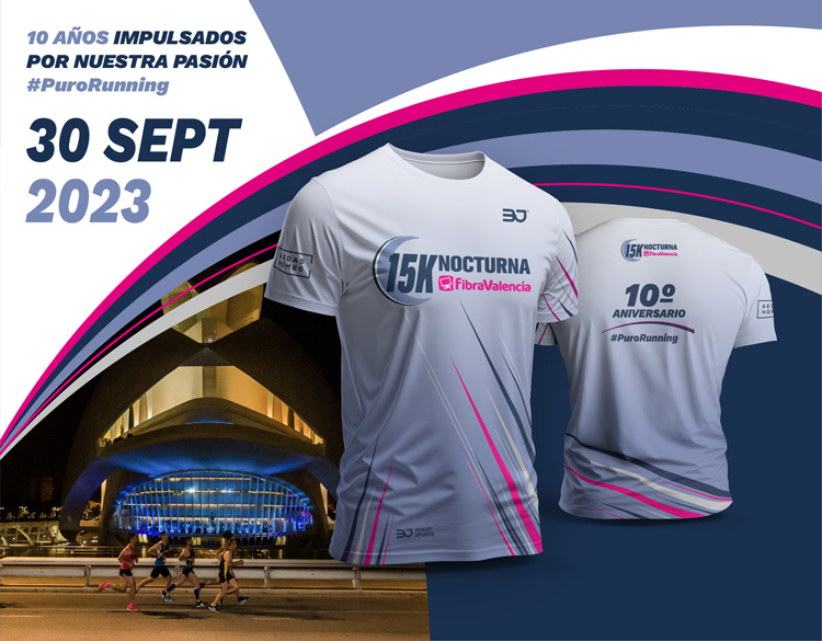 Últimas semanas para sumarse al 10ª aniversario de la 15K Nocturna FibraValencia Miles de #NightRunners volarán sobre el asfalto el próximo 30 de septiembre en el 10º aniversario de la 15K Nocturna FibraValencia La cuenta atrás para la 15K Nocturna FibraValencia ha comenzado. En menos de un mes las calles de Valencia se impregnarán de #PuroRunning con el 10º aniversario de la carrera nocturna más emblemática de la capital del Turia y quedan los últimos dorsales para poder estar en la línea de salida de su edición más especial. La carrera que forma parte del proyecto Valencia Ciudad del Running como reto complementario en el camino a carreras de mayor distancia como el Medio Maratón (22 de octubre) y el Maratón Valencia Trinidad Alfonso (3 de diciembre). Cuenta con el apoyo de la Fundación Trinidad Alfonso como entidad colaboradora. La organización de la prueba está ultimando todos los detalles para que los amantes del running puedan vivir una experiencia única el próximo 30 de septiembre. Miles de corredores quemarán suela sobre el asfalto recorriendo los lugares más emblemáticos de la ciudad, como la Ciudad de las Artes y las Ciencias, las Torres de Serranos, la calle de la Paz y la plaza del Ayuntamiento. La carrera, que ya es cita obligada para arrancar el otoño runner, cuenta con un trazado diseñado para batir marcas en el que el corredor popular podrá ponerse a prueba y superar sus límites. Camiseta oficial La organización, junto a Benjo Sports, ha preparado la camiseta conmemorativa con un diseño exclusivo para que todos los corredores puedan vestir los colores de la prueba. La prenda cuenta con la calidad que atesora Benjo Sports y que garantiza comodidad y rendimiento. La camiseta se entregará junto al racepack en la Feria del Corredor. Recorrido La 15K Nocturna FibraValencia tiene un recorrido homologado por la Real Federación Española de Atletismo y está diseñado para volar sobre el asfalto. A continuación, se pueden observar todos los detalles del trazado de la prueba. Más información y últimos dorsales: www.15knocturnavalencia.com