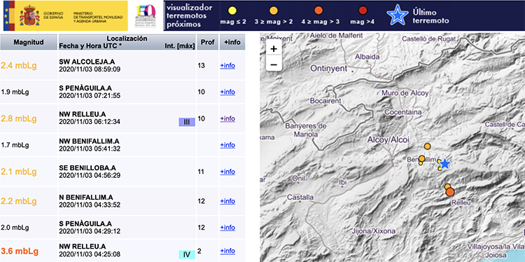 Un nuevo terremoto en Alicante Esta madrugada Alicante ha sufrido tres movimientos sísmicos, siendo el de Relleu de 3,6 de magnitud el que se ha notado en varias poblaciones El Instituto Geográfico Nacional (IGN) ha detectado esta madrugada un terremoto en el interior de Alicante. El temblor ha tenido lugar a las 05:25:08 con el epicentro en Relleu, en la comarca de la Marina Baixa. La magnitud ha sido de 3,6 y con unos 2,4 kilómetros de profundidad y se ha notado en varias poblaciones. El servicio de emergencias de la Generalitat Valenciana ha informado vía Twitter que esta noche Alicante ha sufrido tres movimientos sísmicos dos en Relleu y uno en Penàguila. Los de Relleu se han sentido en Torremanzanas, Benifallim, Alcoi, Benidorm y Gandia. Consulta qué hacer antes, durante y después de un terremoto. Alicante ha sufrido esta noche tres movimientos sísmicos: ➡️Dos en Relleu, a las 4.35h., uno de magnitud 3.6 y otro de 3.4. ➡️Y el último, en Penàguila, de 2,8 de magnitud, sentido a Alcoi. Los de Relleu han sido sentido ampliamente por la población de Alcoi, Benidorm y Gandia. https://t.co/kSYBjBpPGP — GVA 112CV (@GVA112) November 3, 2020 Acabamos de notar un fuerte terremoto aquí en Alcoy. En esta zona han salido la mayoría de los vecinos al balcón incluso…#Alcoy #Alicante #terremoto — Copérnico García (@copernicogarcia) November 3, 2020 Puede que me acabe de despertar un terremoto en Alicante? Yo digo sí — Mireia ? (@srtab_) November 3, 2020 ¿Alguien más se acaba de despertar con la sacudida? #Terremoto #Terratremol #Alicante #Xixona #Alcoy #Cocentaina #MurodeAlcoy pic.twitter.com/6KyHATYUto — José del Valle ⚙️ (@_JDValle) November 3, 2020