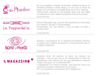 Actualmente, Vicios italianos se ha consolidado con los restaurantes: La Pappardella, Il Pomodoro y Sorsi e Morsi. También forma parte del grupo: Il Magazzino, un almacén que funciona como una central de compras y distribución al por mayor.