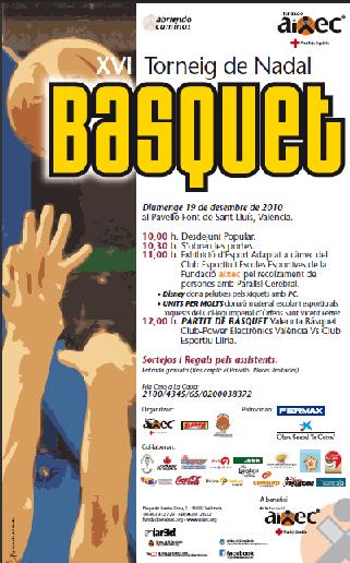 XVII Torneo de Baloncesto Fundación Aixec El Torneo de Baloncesto de Navidad enfrentará hoy a veteranos del Valencia Basket y los del CEB Llíria en un partido solidario. La Fundación Aixec organiza como cada año el tradicional Torneo de Baloncesto de Navidad. La XVII edición se realizará el próximo viernes 23 de diciembre en la Fonteta de San Luís a partir de las 18:30 horas, y tendrá su punto culminante con la disputa del partido entre el equipo de veteranos del Valencia Basket y los del CEB Llíria. Durante el evento se realizará, además, una acción solidaria, la donación a los niños de Aixec de peluches Disney obtenidos en su campaña ‘El árbol de los deseos’ y habrá multitud de sorteos y regalos. La Fundación Aixec, promovida por Cruz Roja y por Aspace Valencia, trabaja a favor de las personas con parálisis cerebral, realizando un amplia gama de servicios, programas y eventos sociales que permitan difundir a la sociedad en general la realidad de nuestro colectivo, mostrando tanto las necesidades que aparecen a lo largo de su vida como las capacidades que pueden desarrollar que pueden desarrollar con un buen apoyo. 18,30 h: Apertura de puertas y merienda popular. (Chocolate y fartons) 19,00 h: Exhibición de deporte adaptado a cargo de los niños y niñas de las escuelas deportivas municipales de FESA gestionadas por AIXEC. 20,00 h : Partido de baloncesto: Veteranos del Valencia Basquet vs CEB LLiria